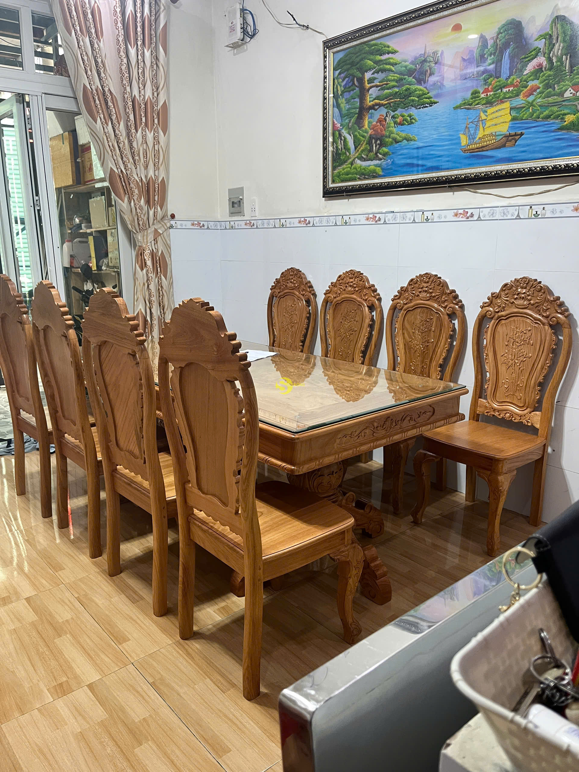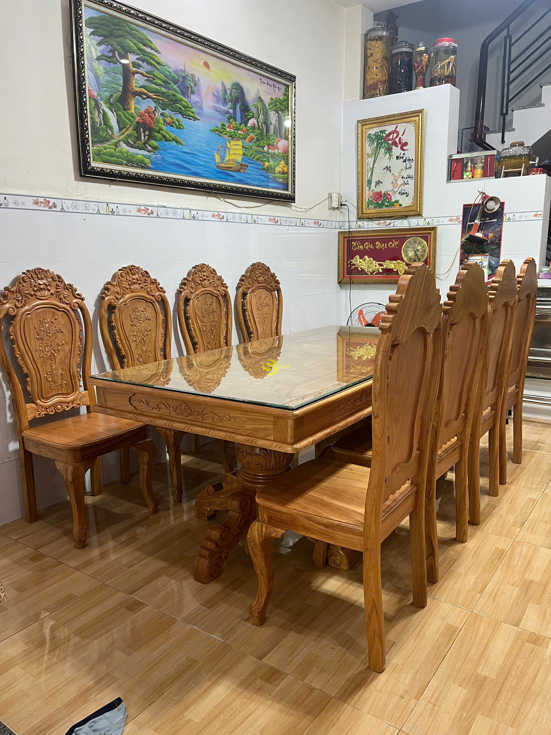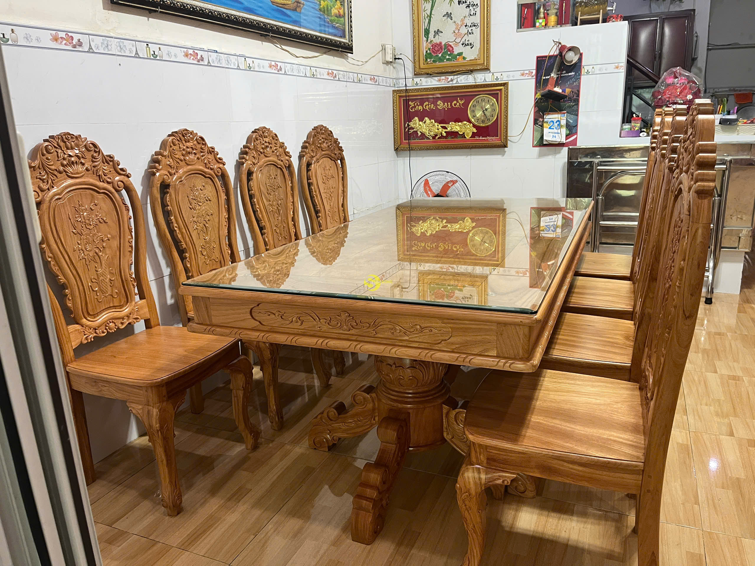 Và đây là hình ảnh bàn giao cho khách anh Hạnh ở quận Bình Tân với bộ bàn ăn 8 ghế chạm họa tiết hoa hồng kết hợp lá tây: