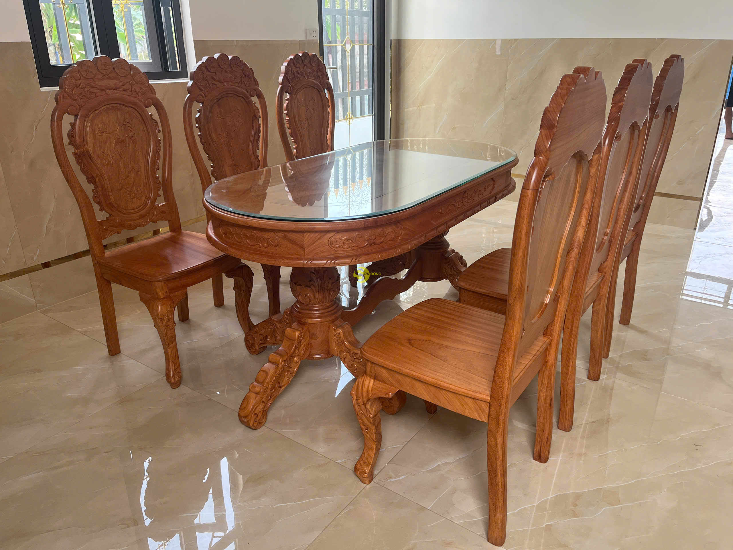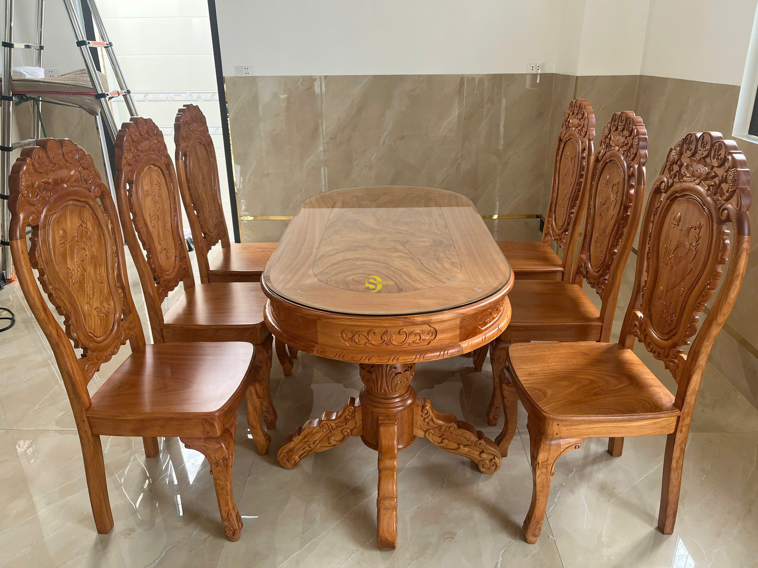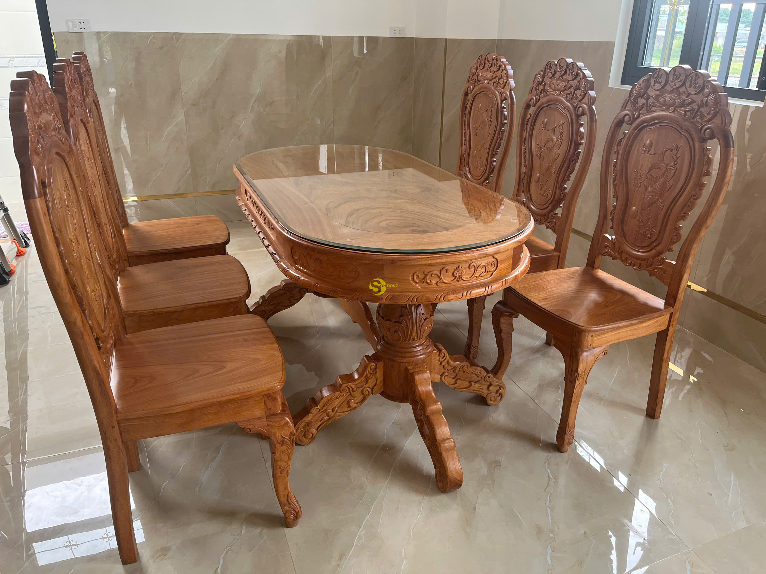 Và ngày hôm nay mời mọi người cùng Nội Thất Sơn Đông đi bàn giao bộ bàn ăn gỗ gõ đỏ Phúc Lộc Thọ 6 ghế cho anh Tâm ở Bình Chánh, anh Tâm là 1 vị khách ghé đến trực tiếp cửa hàng và chốt đơn,