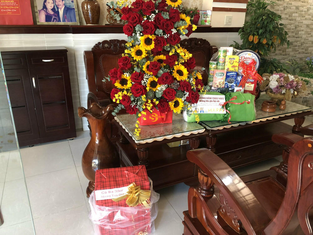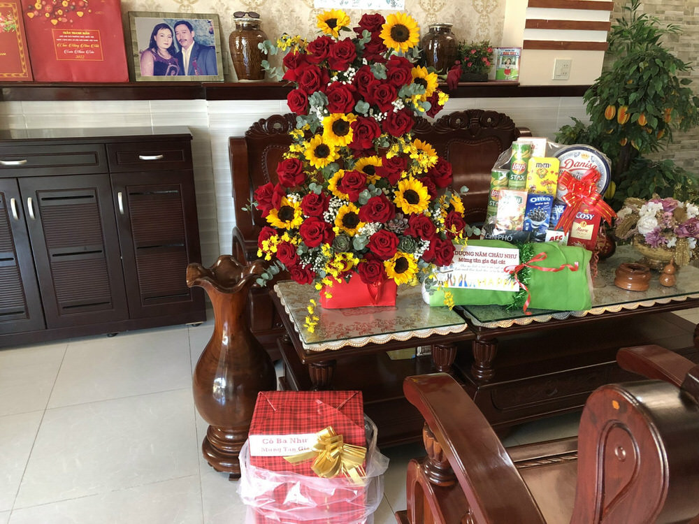 Thế là Sơn Đông đã nhận luôn khâu đóng gói, mua hoa cho chị luôn và đây là thành quả ạ: