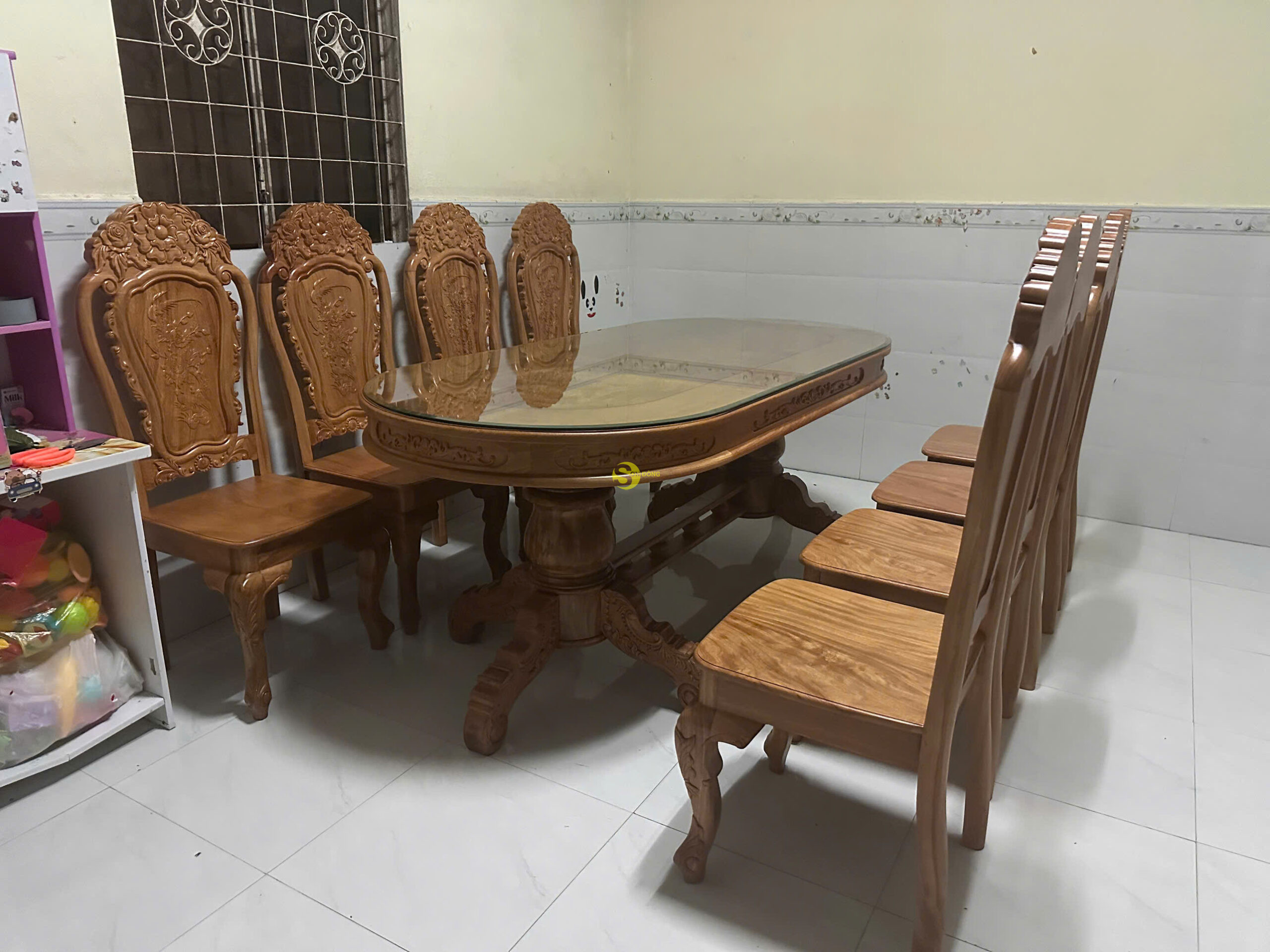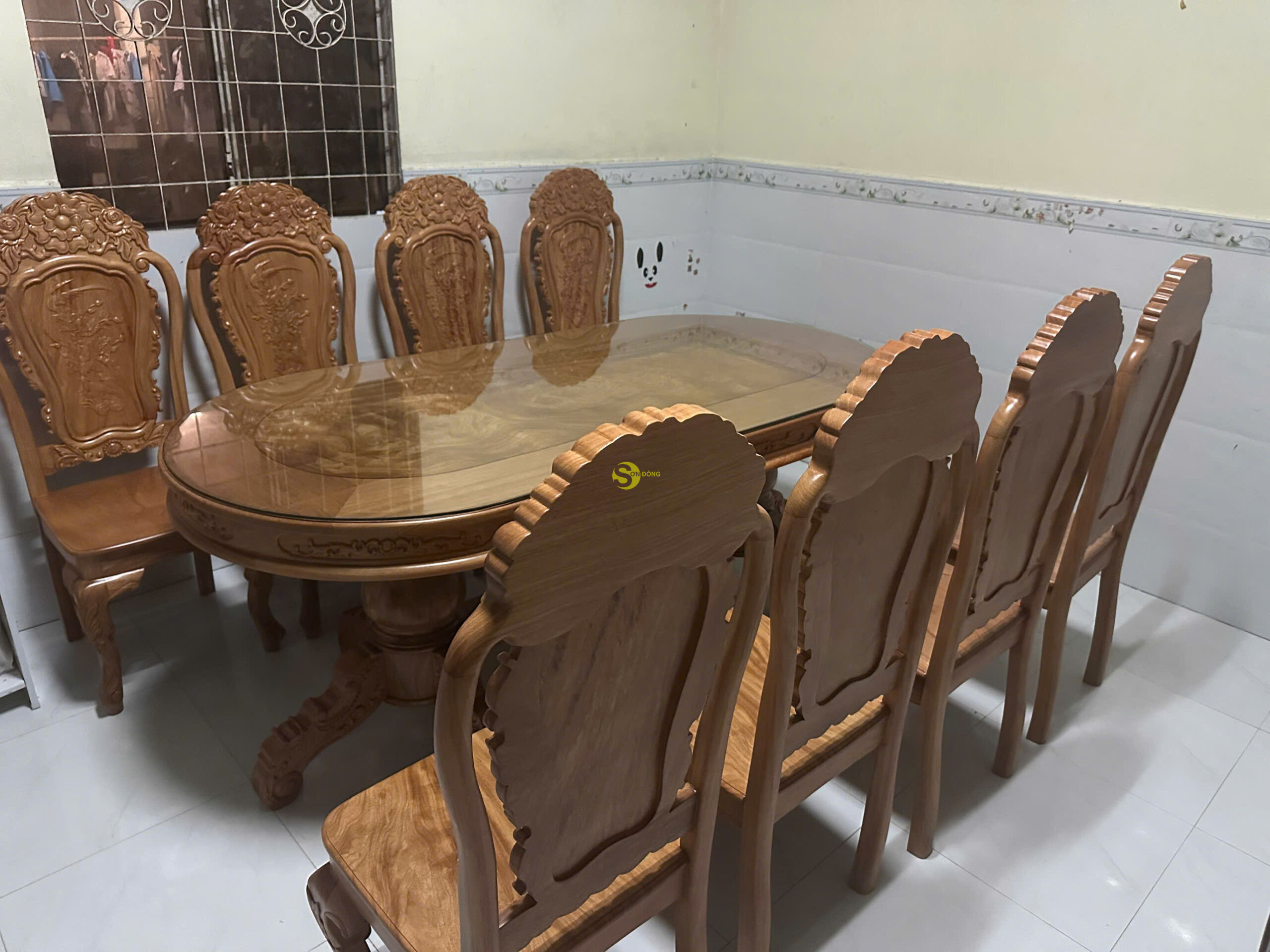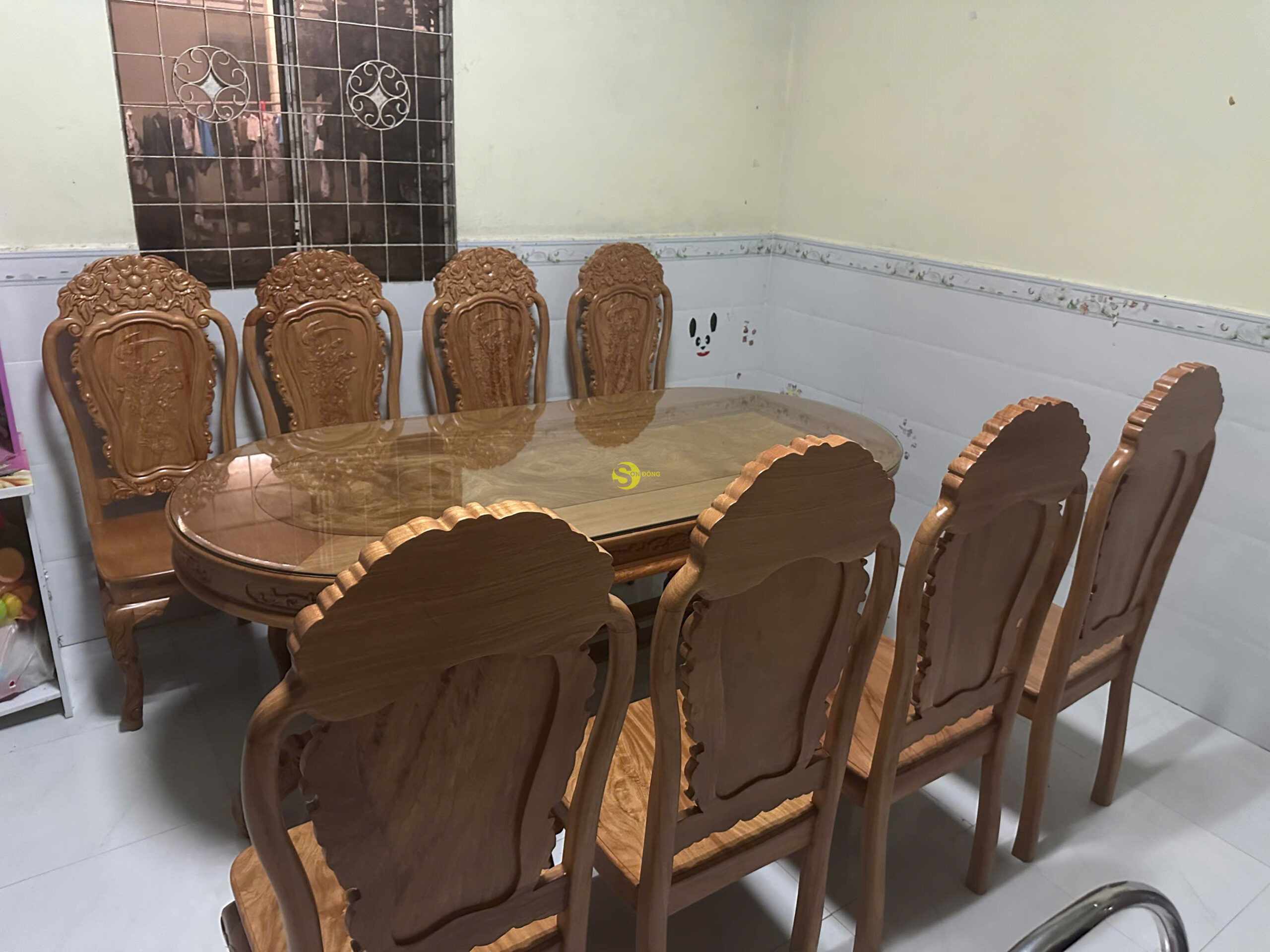Bộ bàn ăn chị Hoa chọn được làm từ 100% gỗ Gõ Đỏ Pachy, phần bàn được làm kích thước siêu to, kết hợp 08 chiếc ghế ăn được hoàn thiện với hình ảnh hoa hồng siêu đẹp. Phần gỗ cũng đã được xử lí và tẩm sấy kỹ lưỡng nên độ bền mang đến cực kỳ cao. Khi mua bàn ăn này Sơn Đông sẽ tặng kèm kính bàn để hạn chế trầy xước và giữ sản phẩm mới lâu hơn trong quá trình sử dụng.
