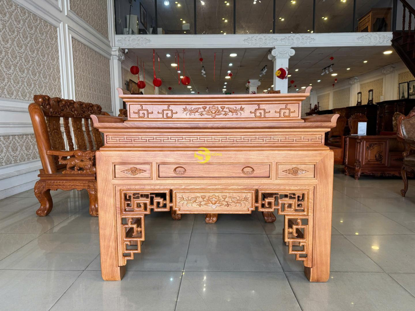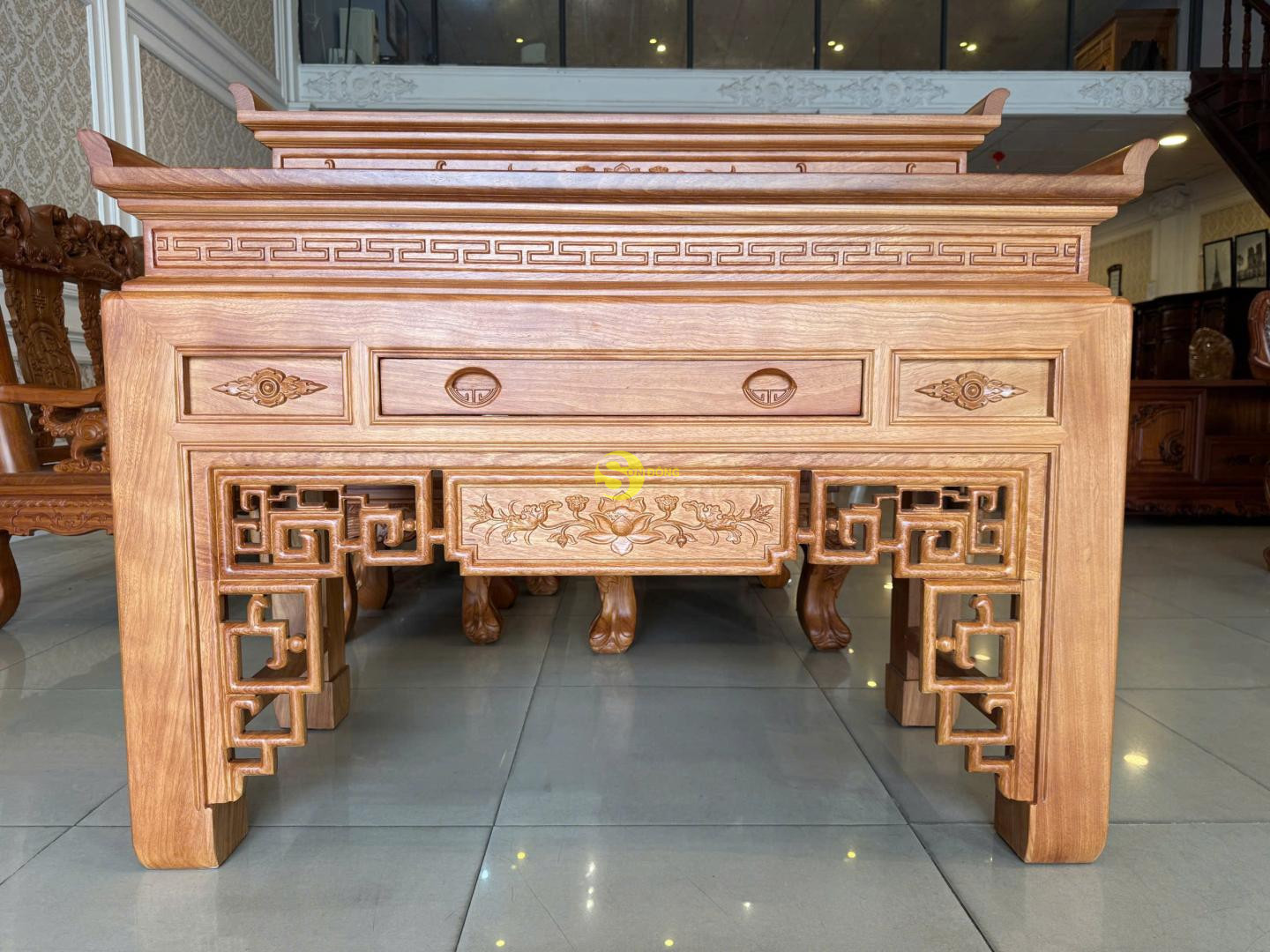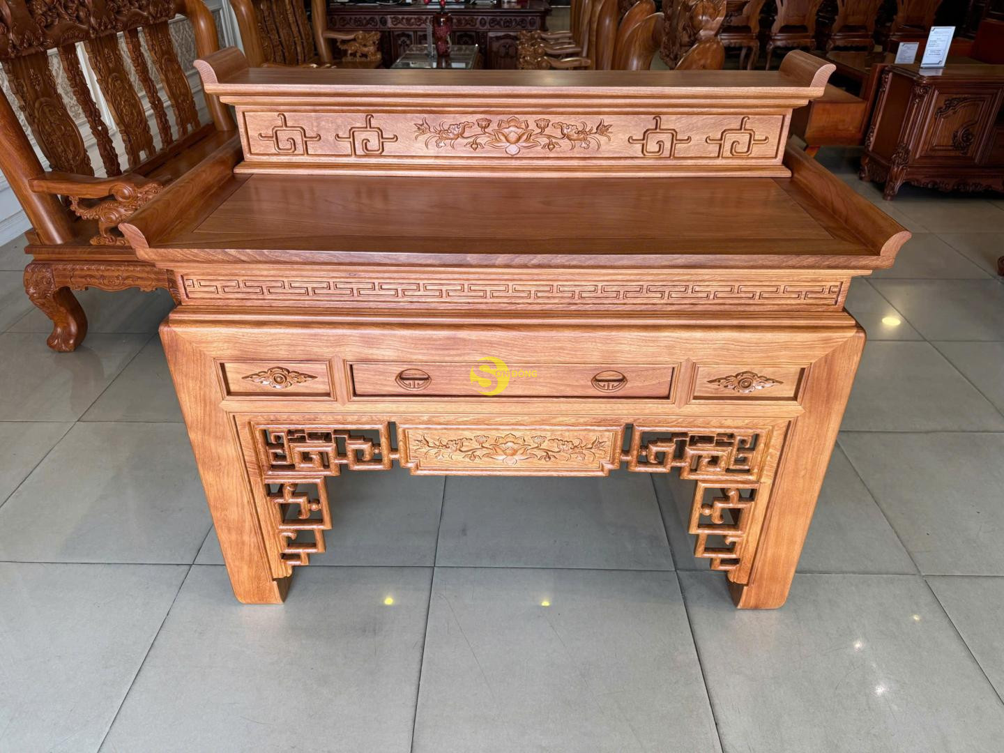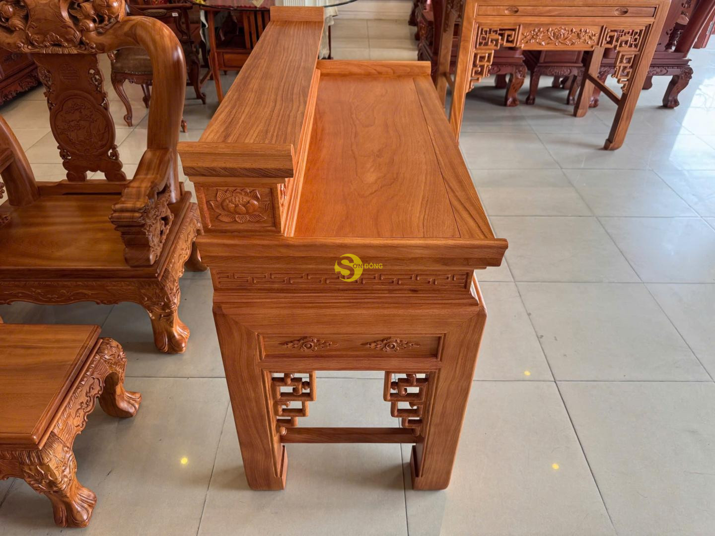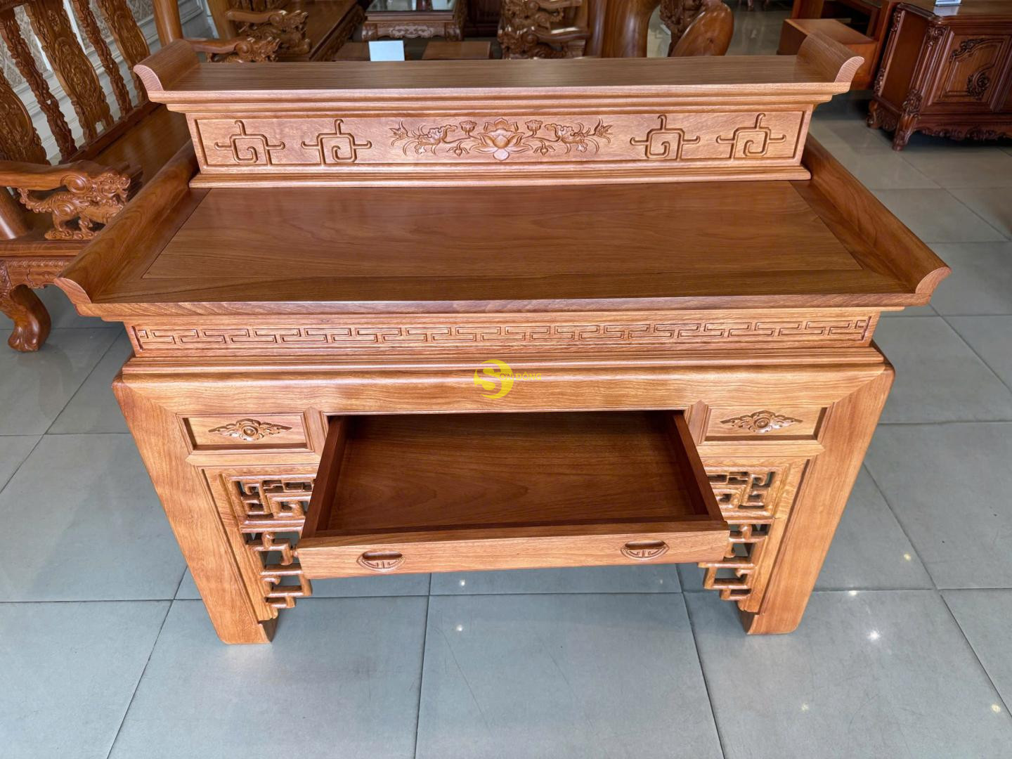 Bàn thờ nhị cấp hoa sen gỗ gõ đỏ là sự kết hợp hài hòa giữa giá trị tâm linh truyền thống và vẻ đẹp sang trọng, đẳng cấp của dòng gỗ quý. Thiết kế nhị cấp tạo nên sự phân tầng trang nghiêm, giúp gia chủ dễ dàng sắp xếp bát hương, lư hương, mâm bồng và các vật phẩm thờ cúng một cách gọn gàng, chuẩn phong thủy.