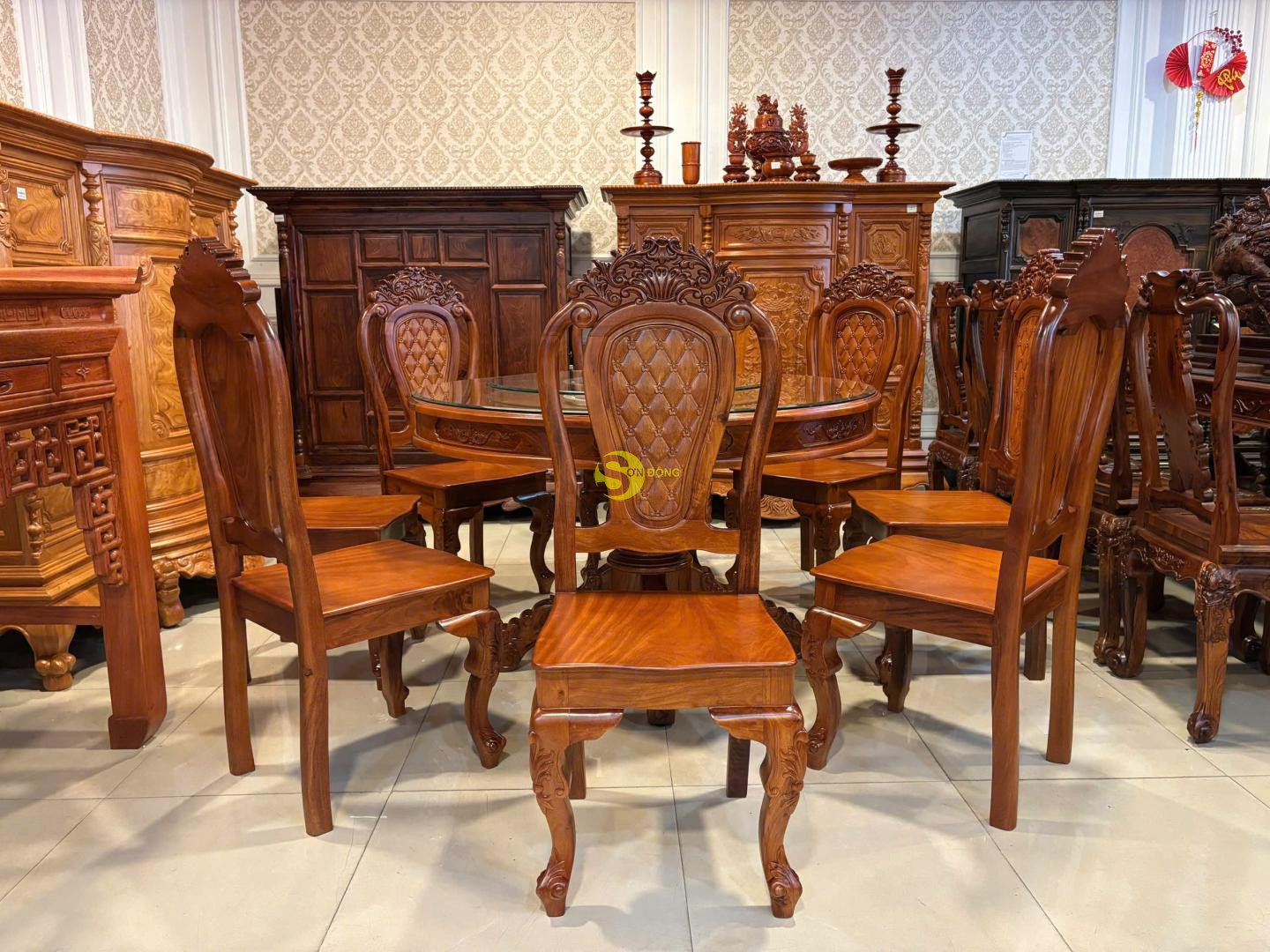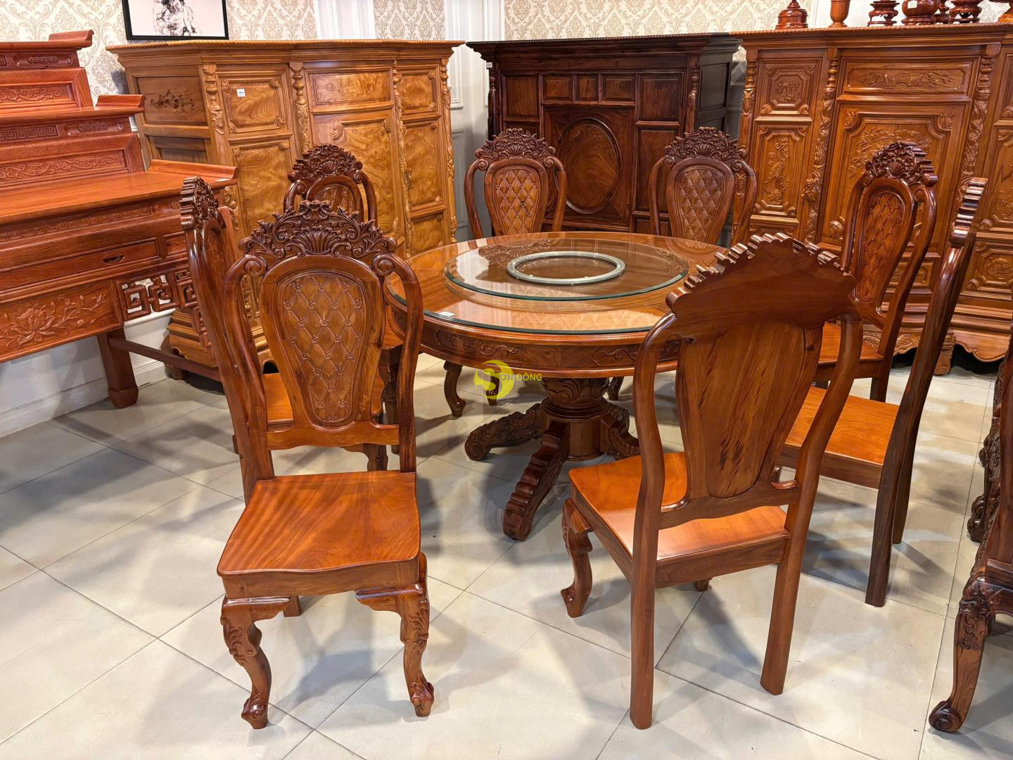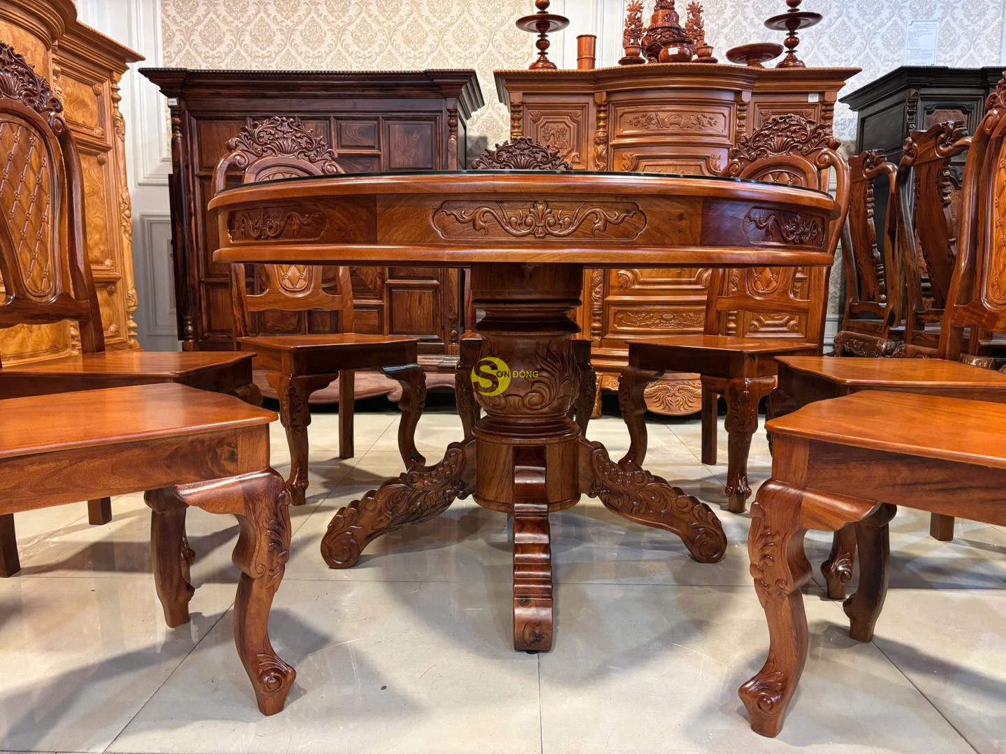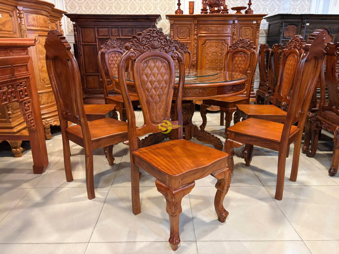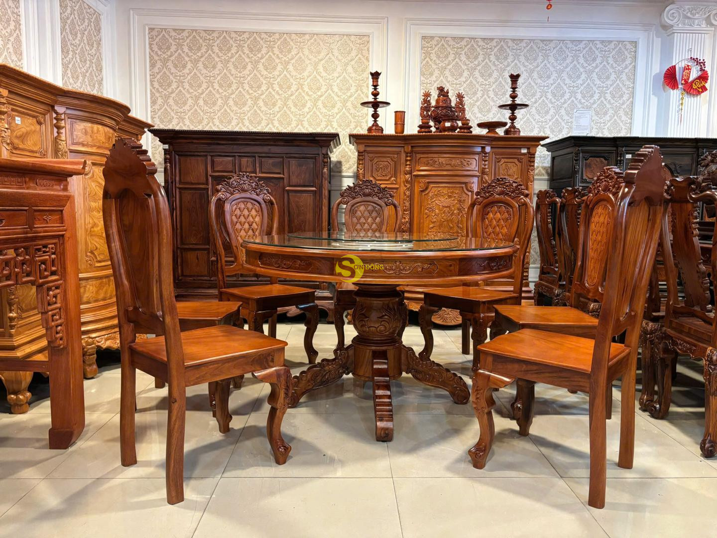 Thiết kế bàn tròn tượng trưng cho sự đoàn viên, ghế chạm hoa mai – biểu tượng của may mắn và phú quý.