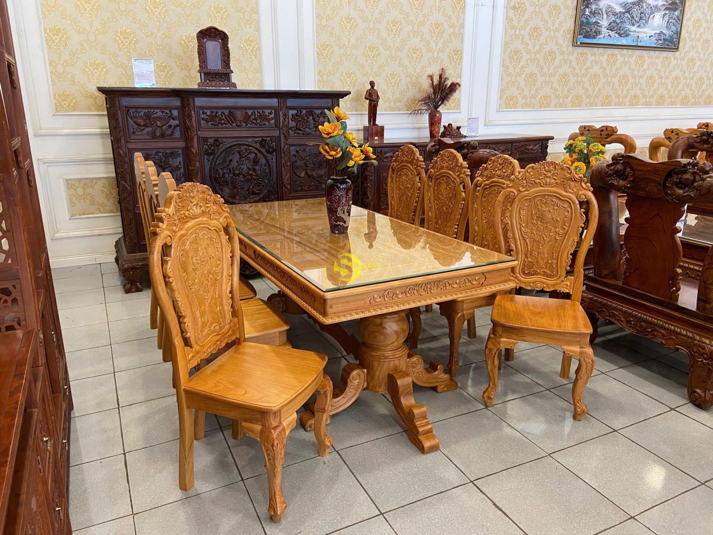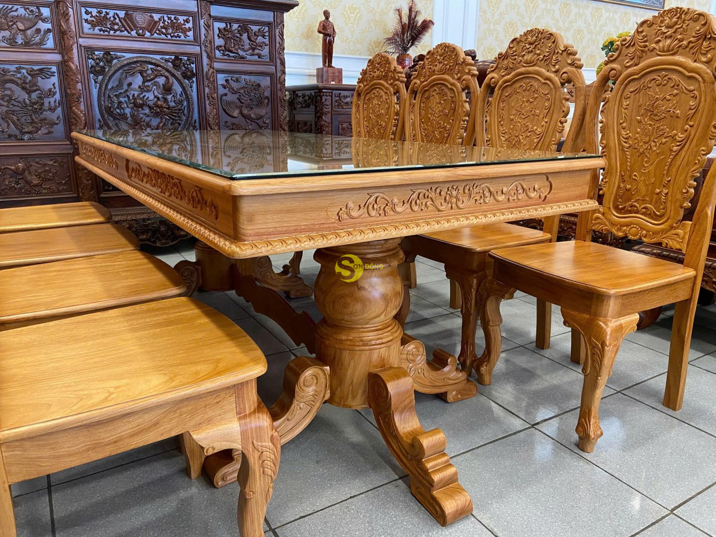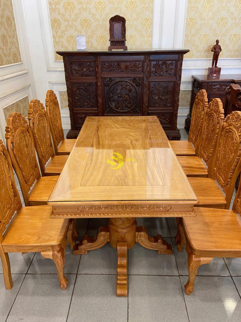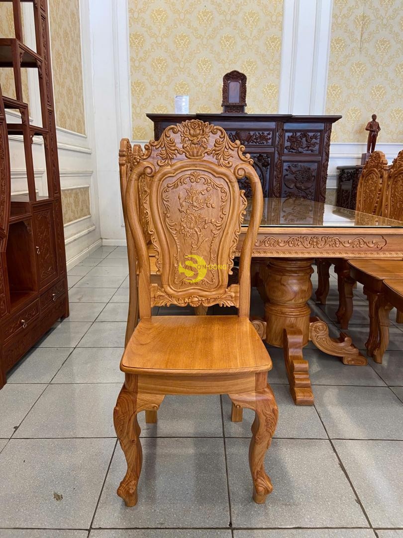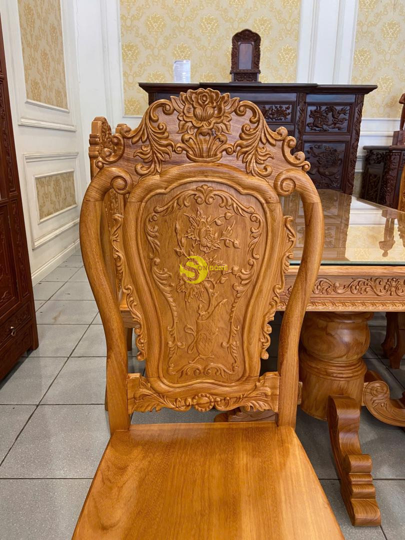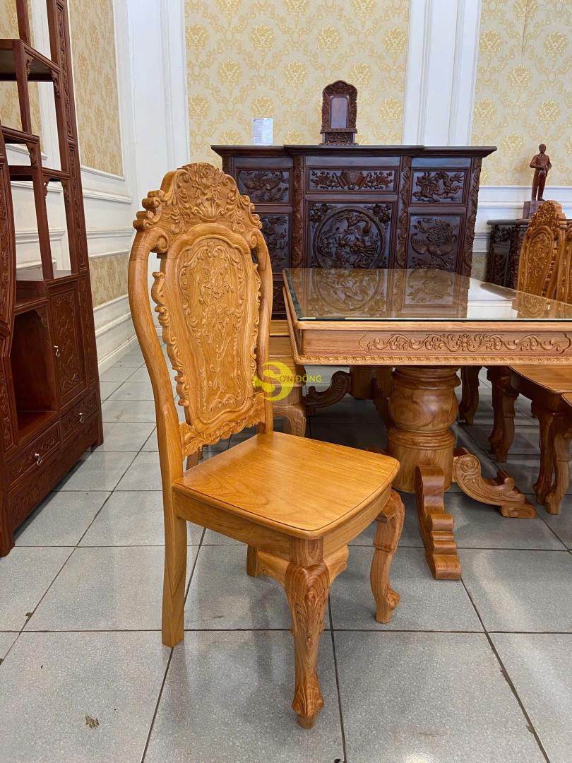 Bộ bàn ăn được chế tác từ gỗ gõ đỏ cao cấp, thiết kế bàn vuông chắc chắn, bề thế. Ghế chạm khắc hoa lá tây tinh xảo, đường cong mềm mại, tạo nét sang trọng và cổ điển. Đây là lựa chọn lý tưởng cho phòng ăn gia đình, vừa bền đẹp vừa tôn lên sự đẳng cấp.