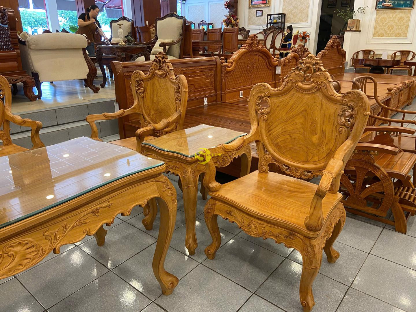 Bộ bàn ghế được chế tác từ gỗ Gõ Đỏ tự nhiên cao cấp, với thiết kế phong cách Louis sang trọng, chạm khắc tinh tế, từng đường cong mềm mại và uyển chuyển. Đặc biệt lưng ghế làm bằng gỗ gõ đỏ Lào giá trị