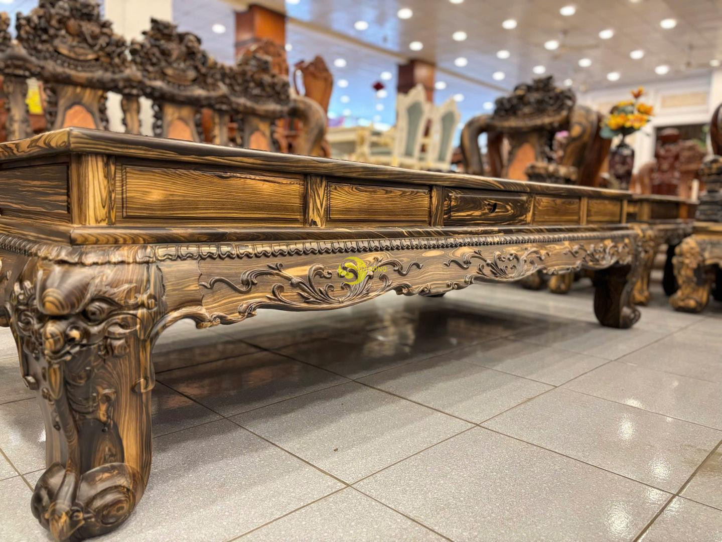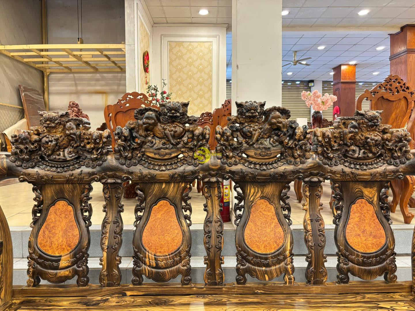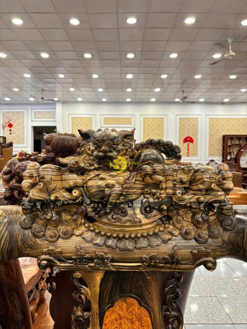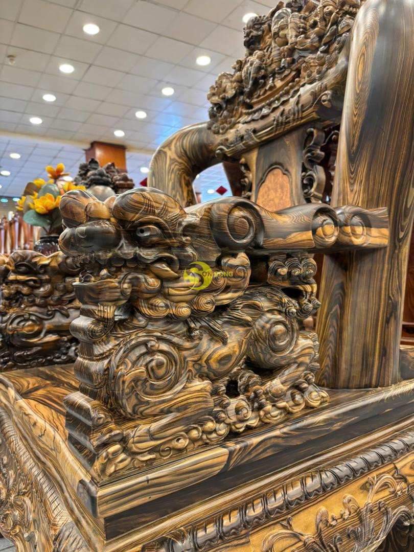 + Phần tựa chạm Nghê Đỉnh tinh xảo, đường nét sâu – sắc, mang ý nghĩa trấn trạch, giữ lộc, thu hút vượng khí. Tay cột 16 dày dặn, liền khối, kết cấu chắc chắn, ngồi đầm và rất nặng gỗ.