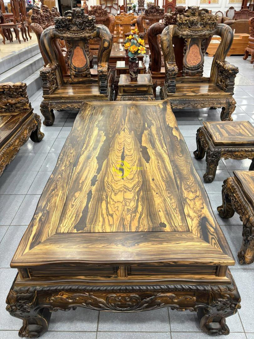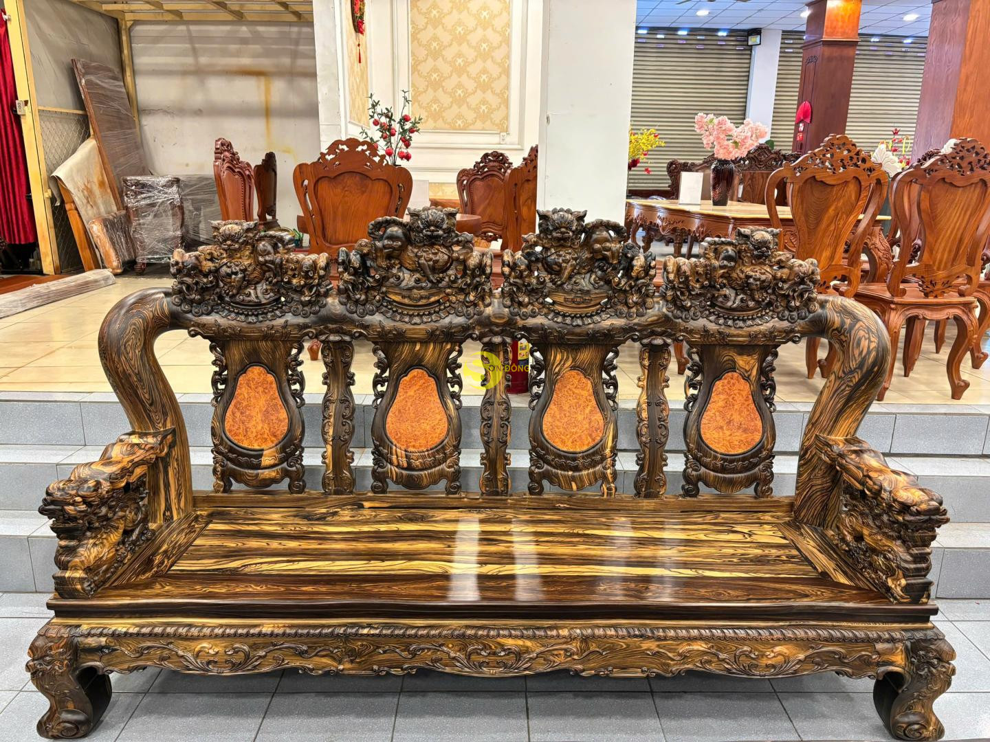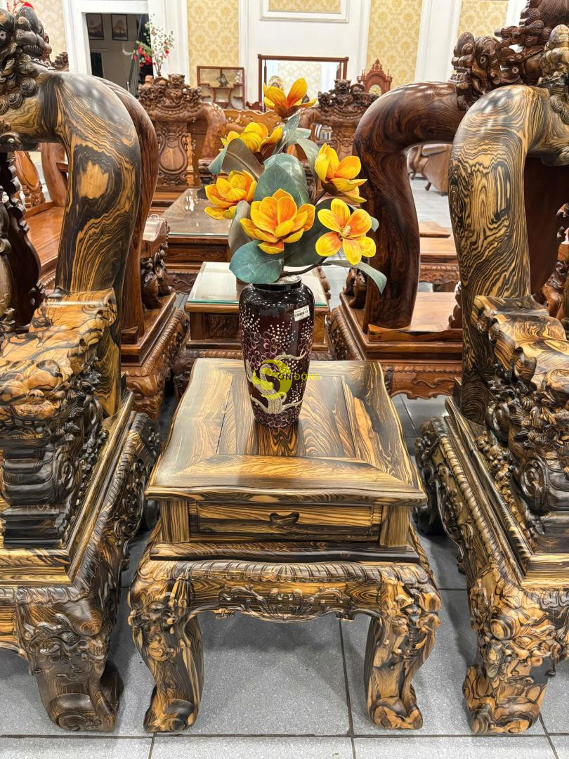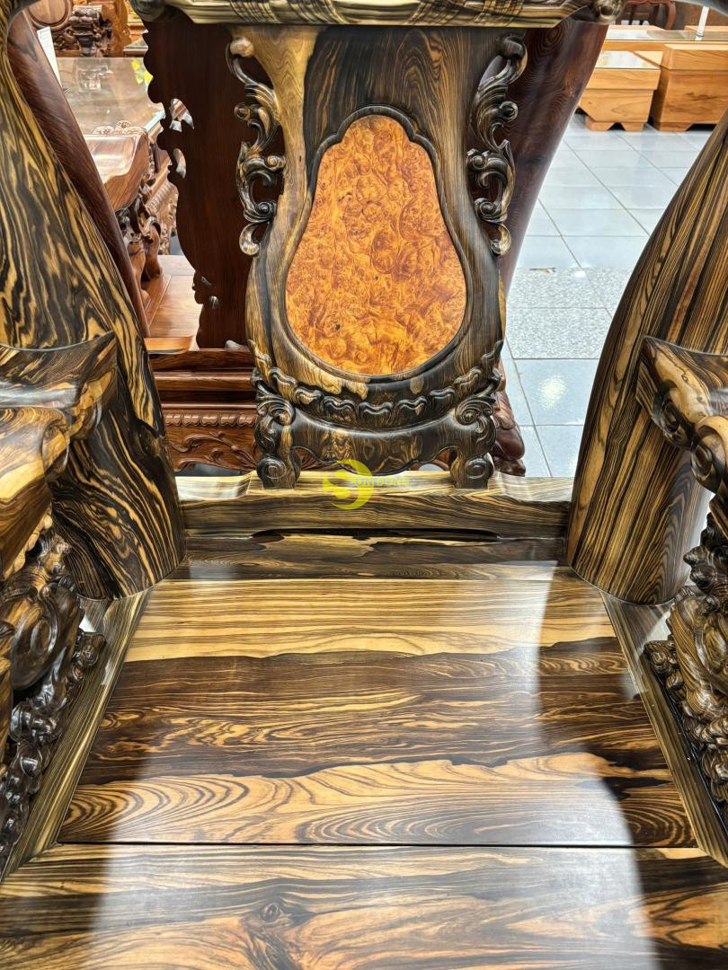 Bộ bàn ghế Nghê Đỉnh tay cột 16 được chế tác từ gỗ mun sọc quý hiếm, nổi bật với vân sọc tự nhiên sắc nét, màu gỗ trầm sang, càng dùng càng lên nước đẹp. Dáng bộ bề thế, uy nghi, thể hiện đẳng cấp không gian phòng khách.