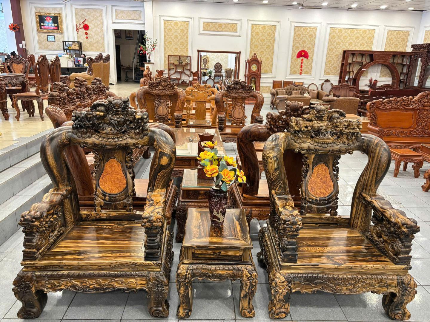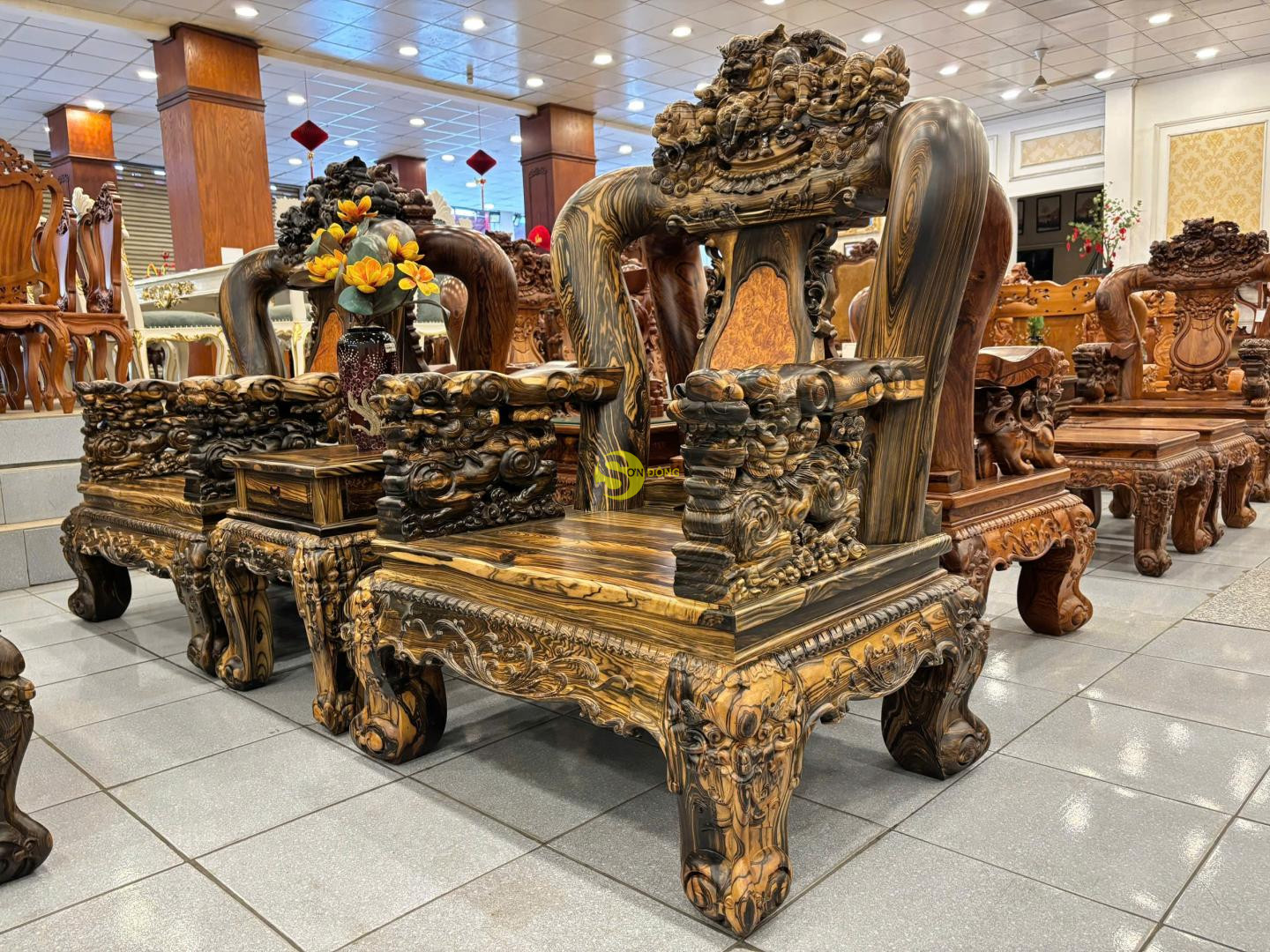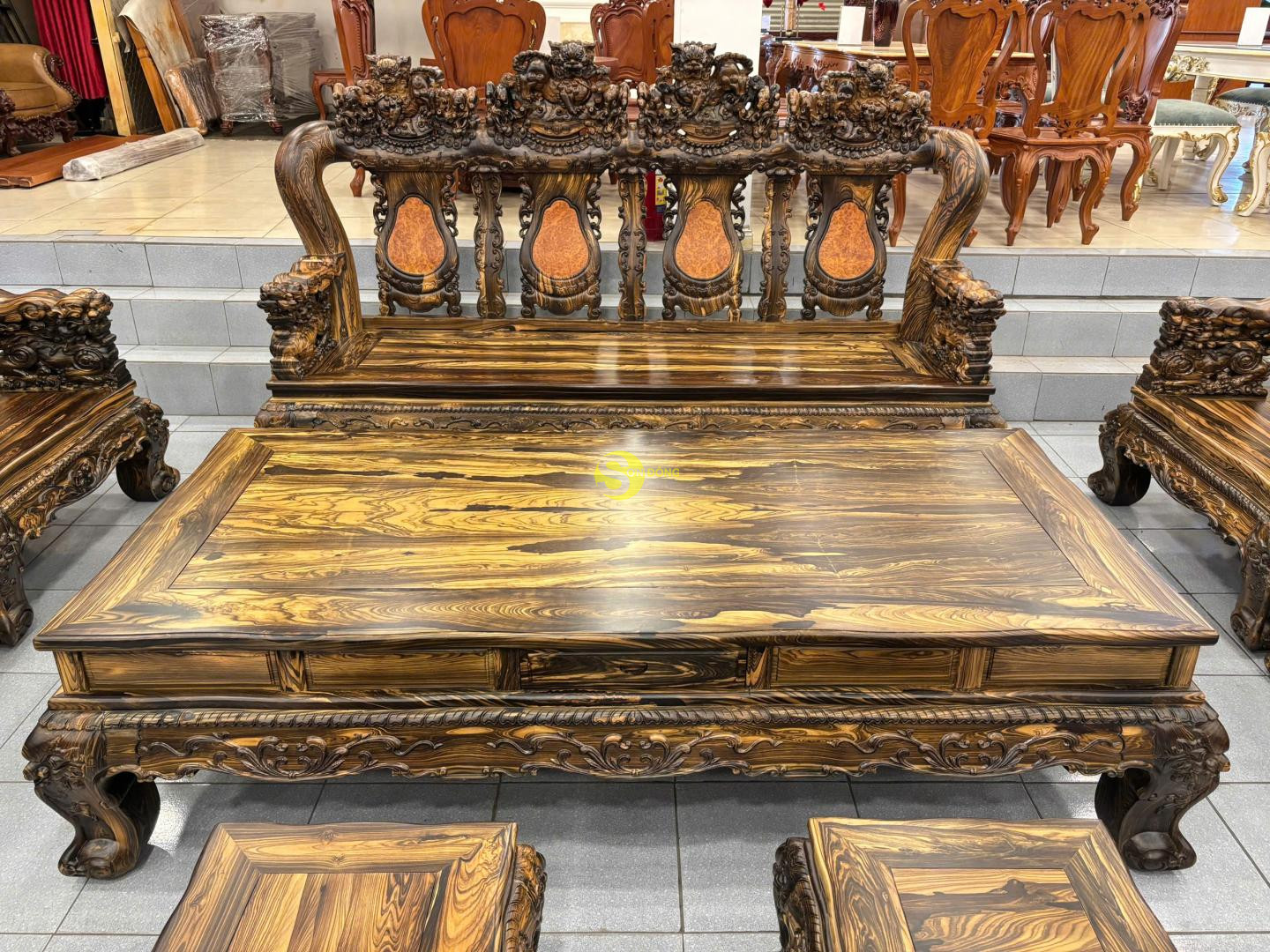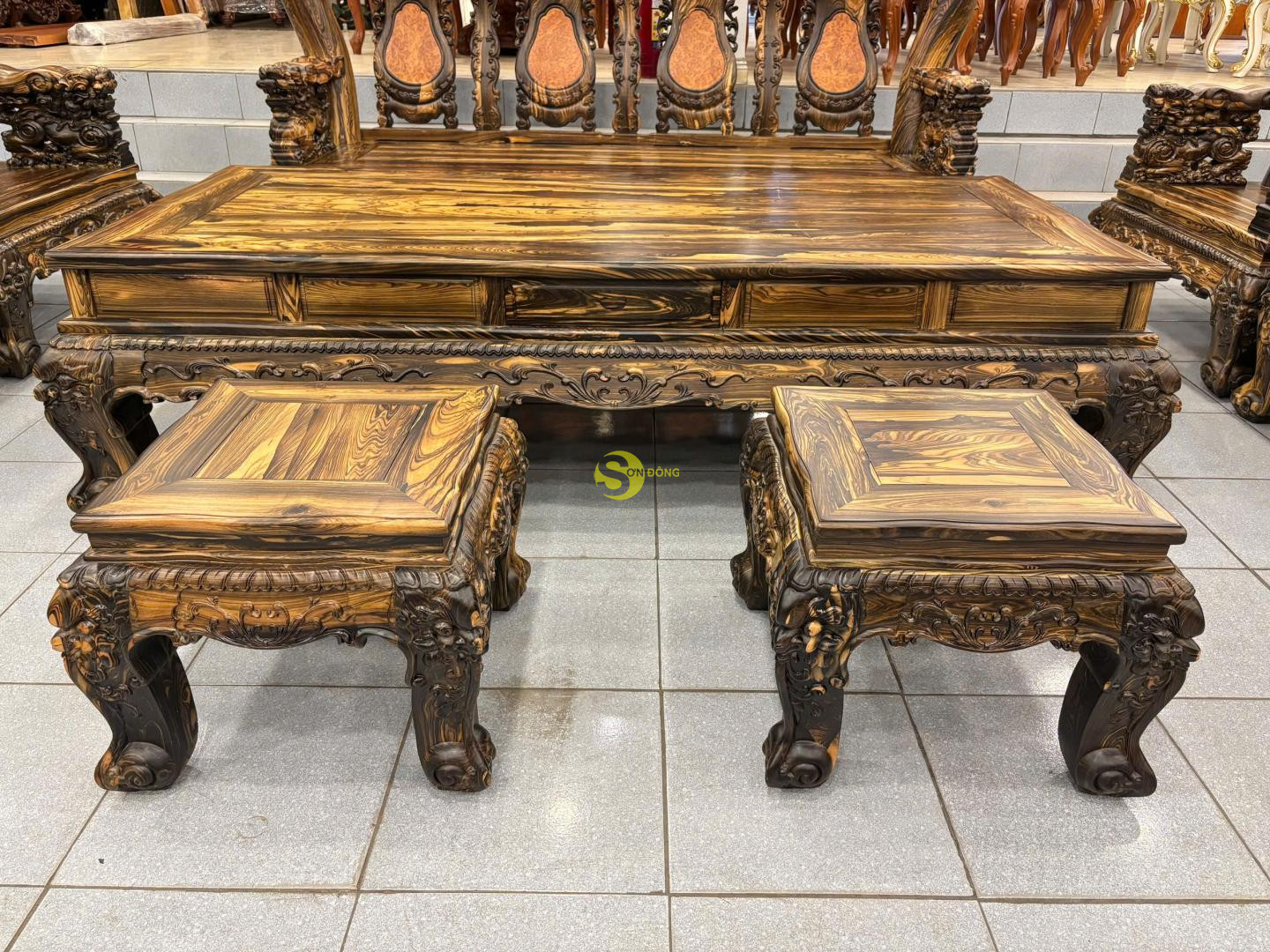 Bộ bàn ghế Nghê Đỉnh tay cột 16 được chế tác từ gỗ mun sọc quý hiếm, nổi bật với vân sọc tự nhiên sắc nét, màu gỗ trầm sang, càng dùng càng lên nước đẹp. Dáng bộ bề thế, uy nghi, thể hiện đẳng cấp không gian phòng khách.