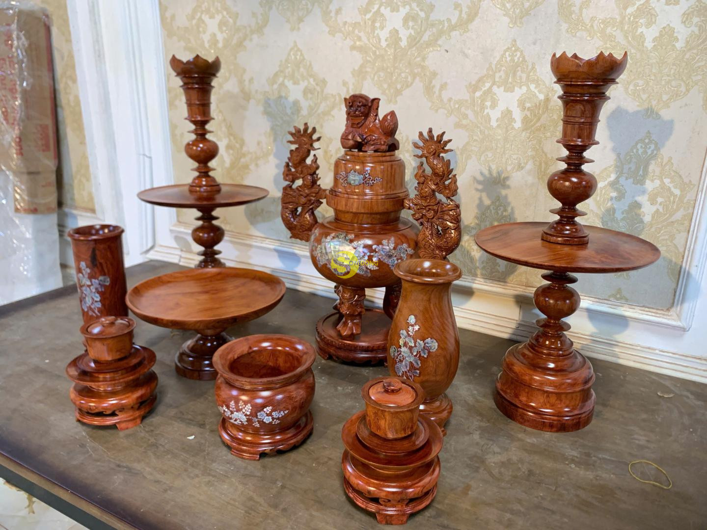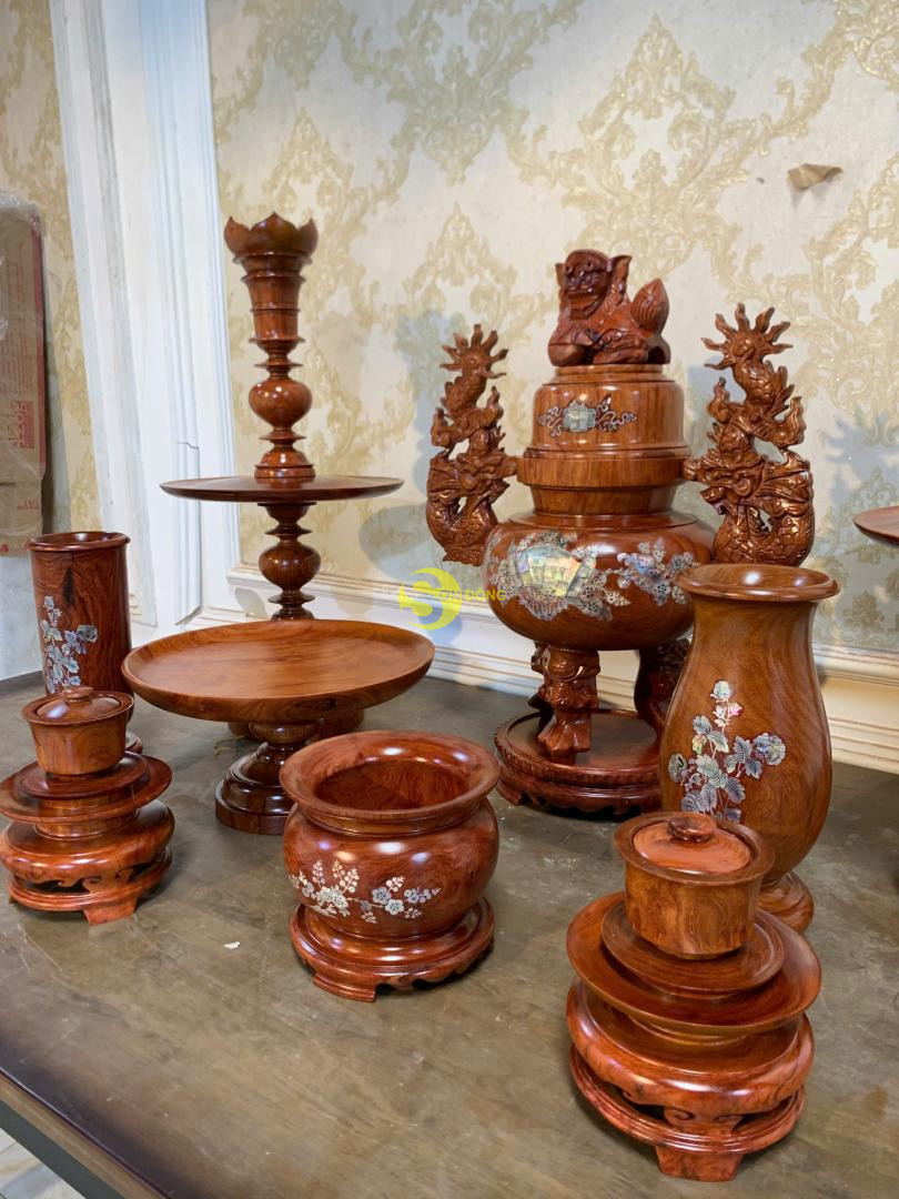 • Bộ gồm 8 món: 1 lư hương 2 chân đèn 1 đĩa 1 ống nhang 1 bát nhang 2 bộ chung nước