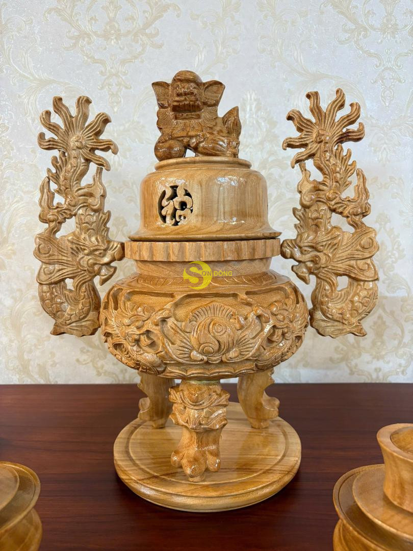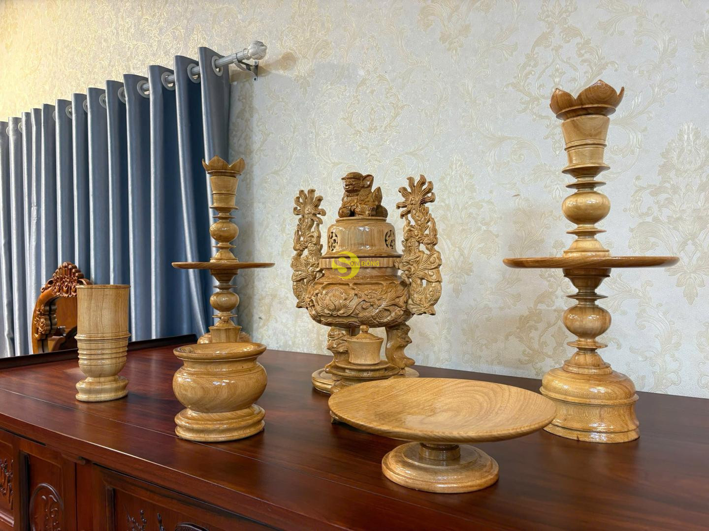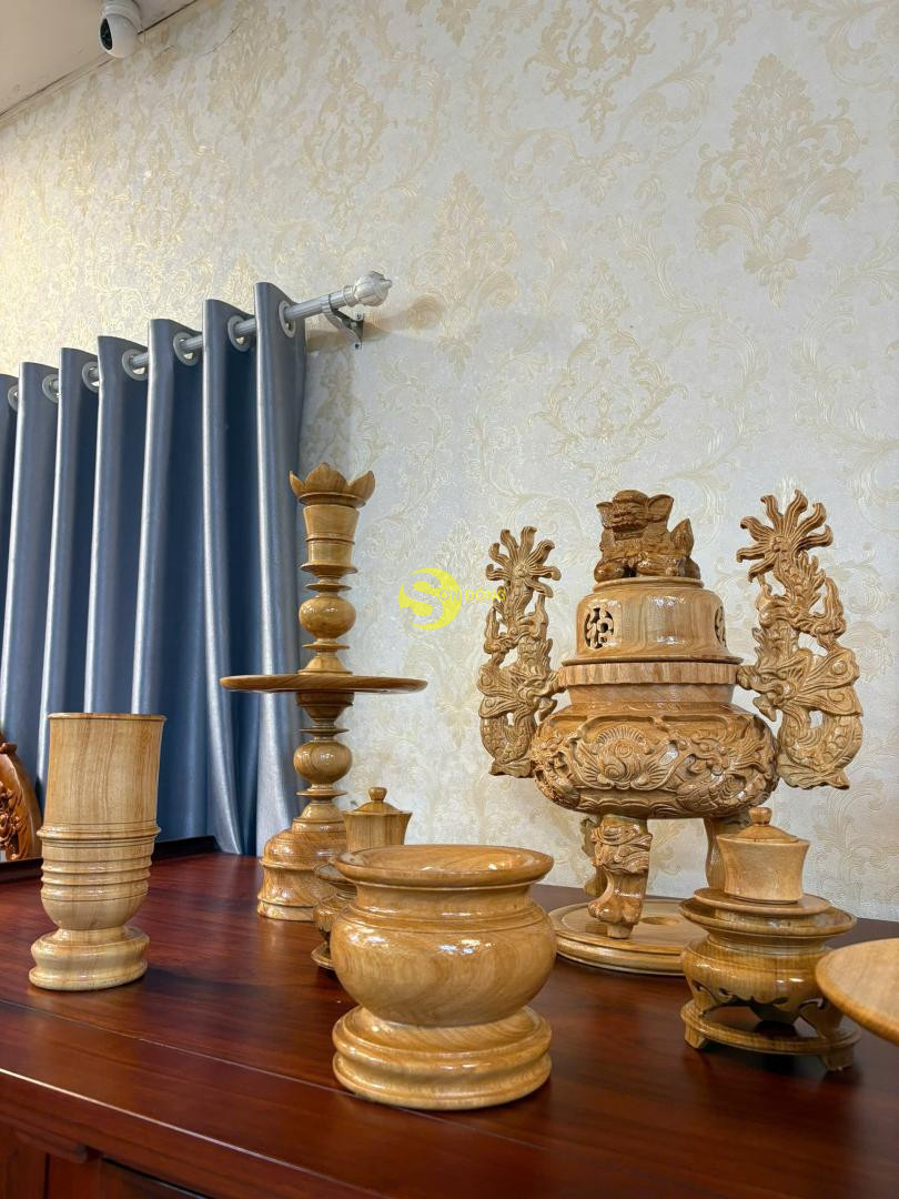 – Bộ gồm 8 món: 1 lư hương, 2 chân đèn, 1 đĩa, 1 ống nhang, 1 bát nhang, 2 bộ chung nước – Chất liệu: Gỗ gõ đỏ