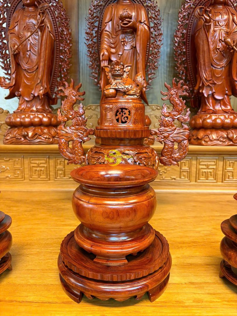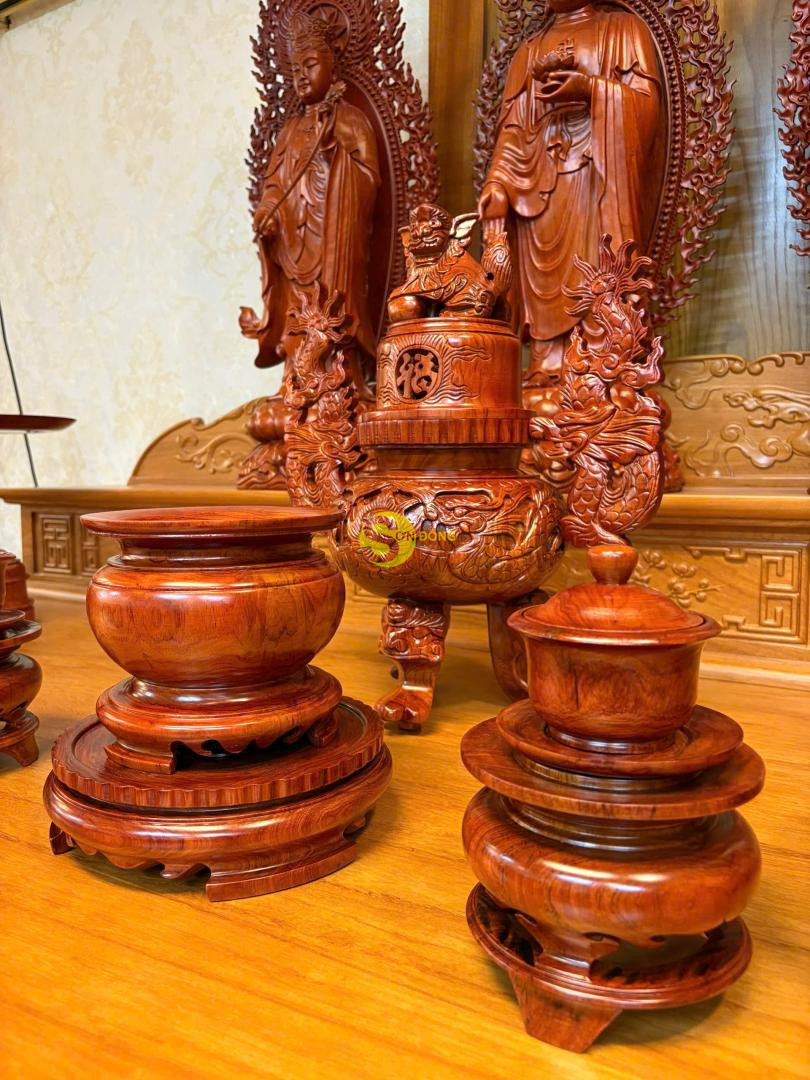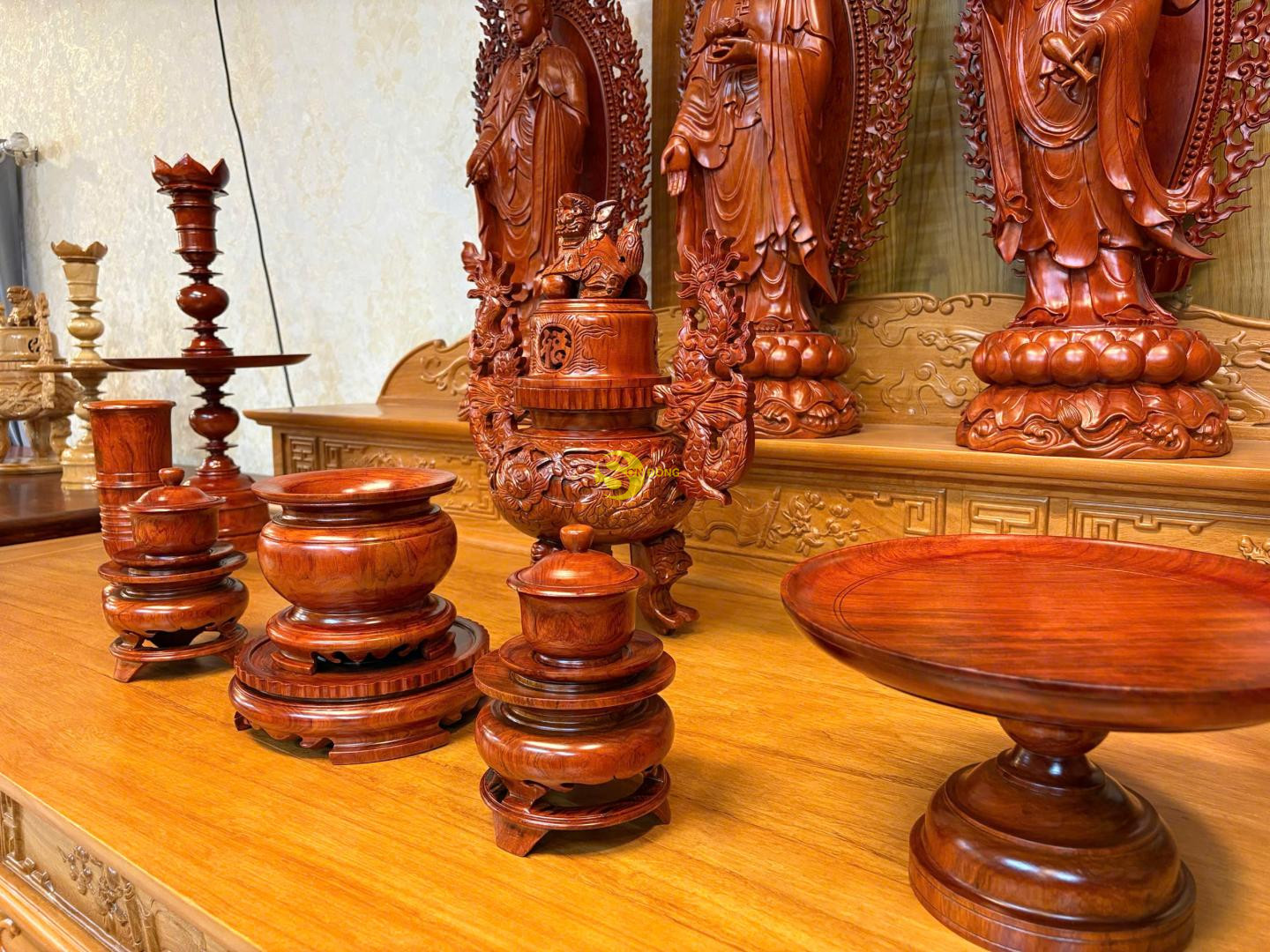 – Bộ gồm 8 món: 1 lư hương 2 chân đèn 1 đĩa 1 ống nhang 1 bát nhang 2 bộ chung nước – Chất liệu: Gỗ hương Việt