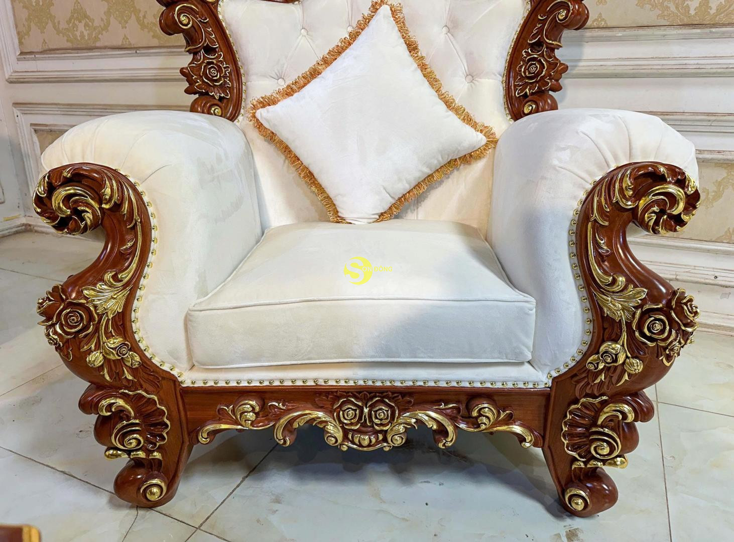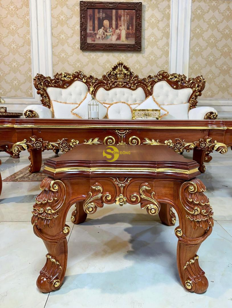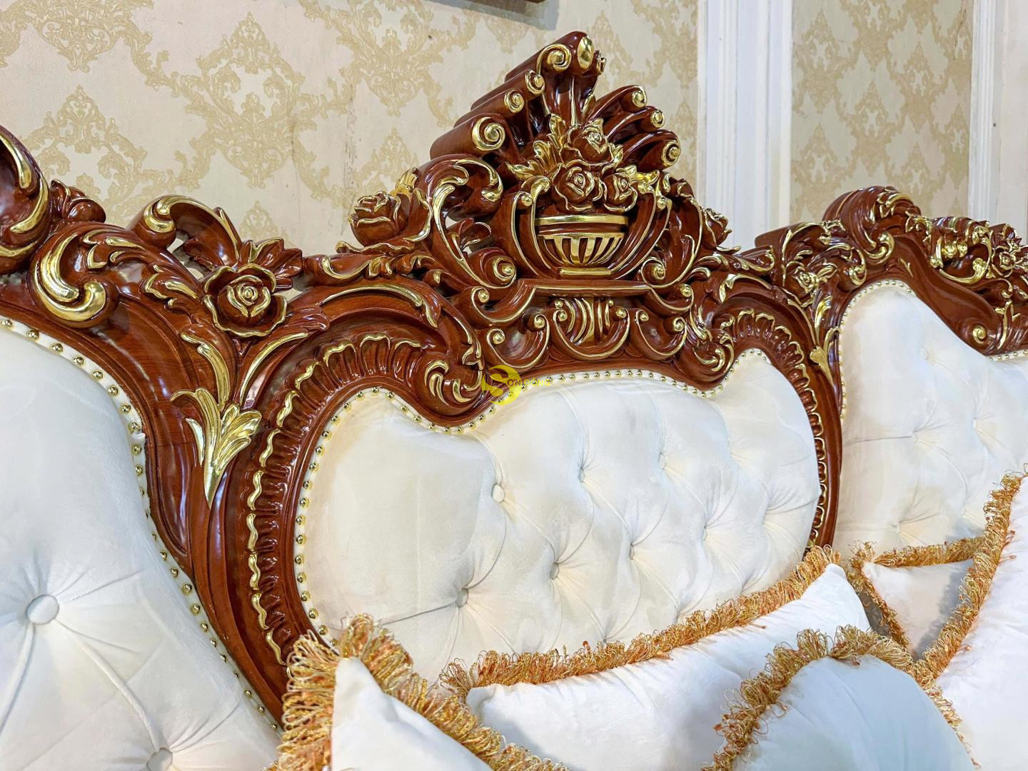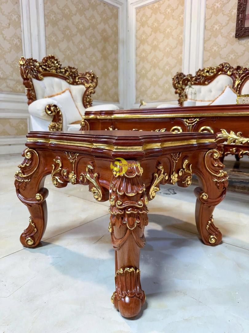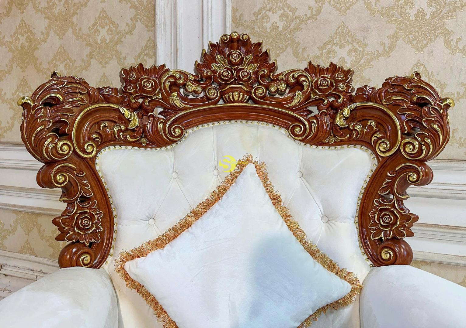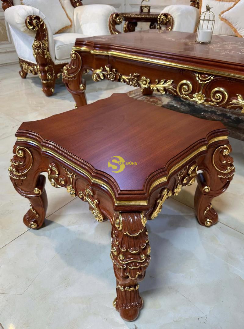 * Chất liệu: gỗ gõ đỏ Nam Phi + dát vàng Ý điểm xuyến + bọc vải nhung Acasia.