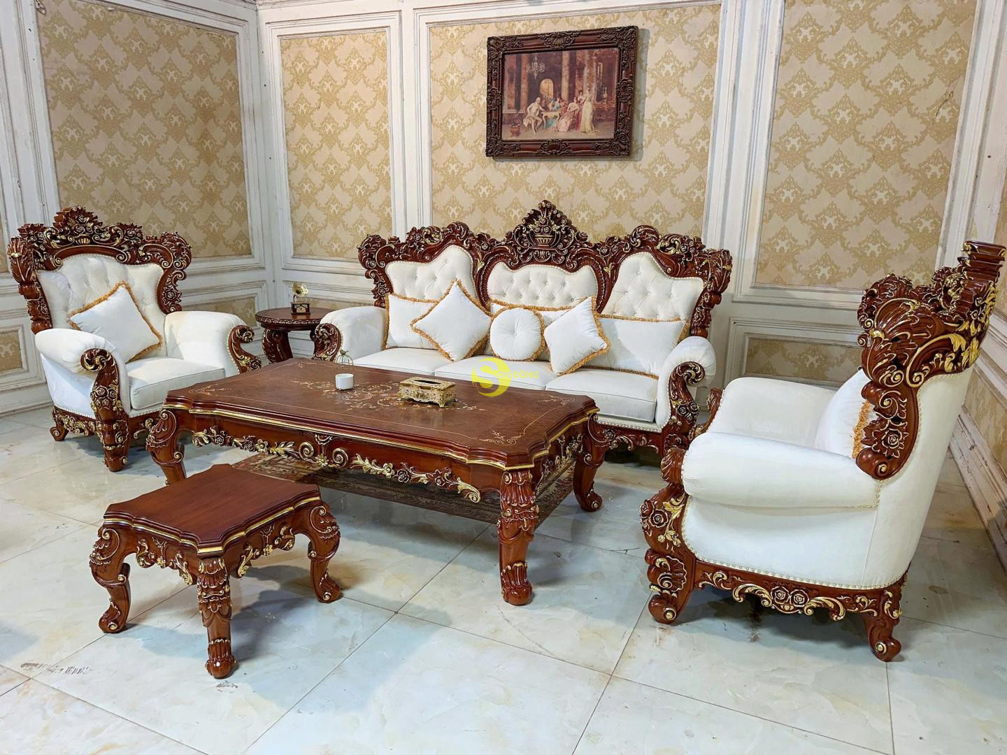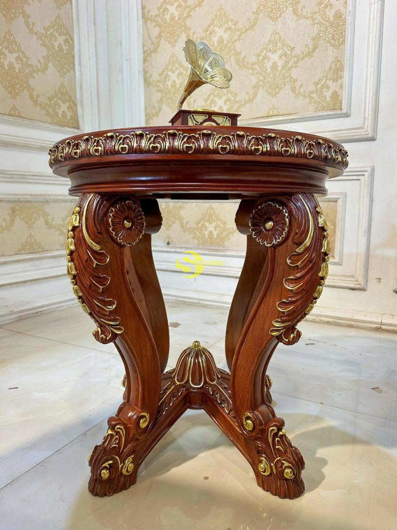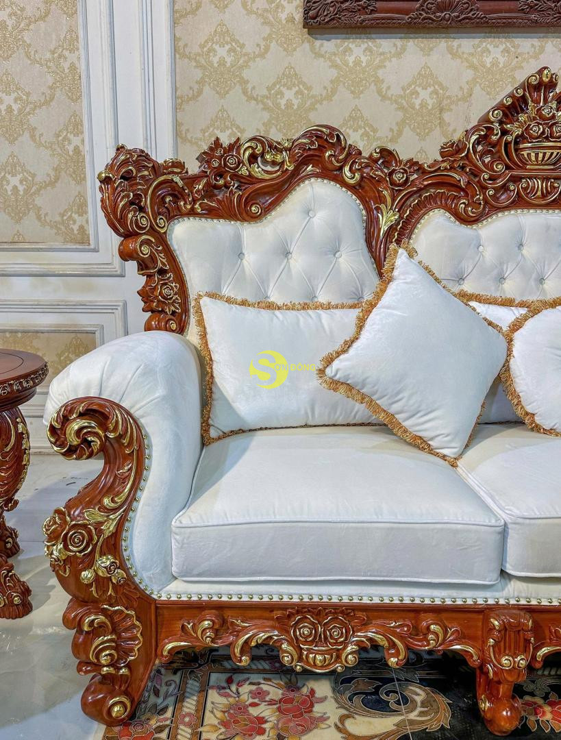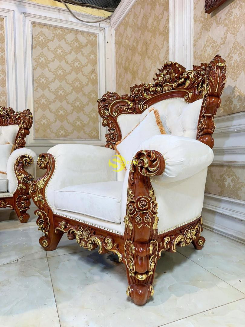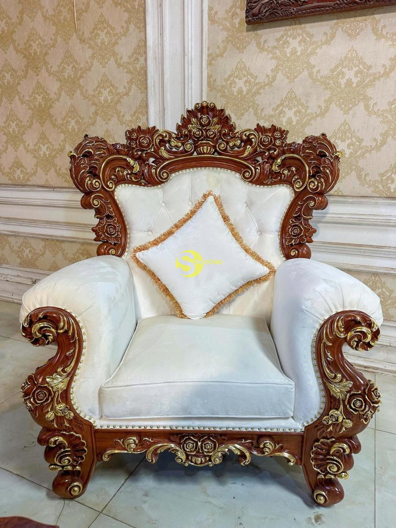 * Chất liệu: gỗ gõ đỏ Nam Phi + dát vàng Ý điểm xuyến + bọc vải nhung Acasia.