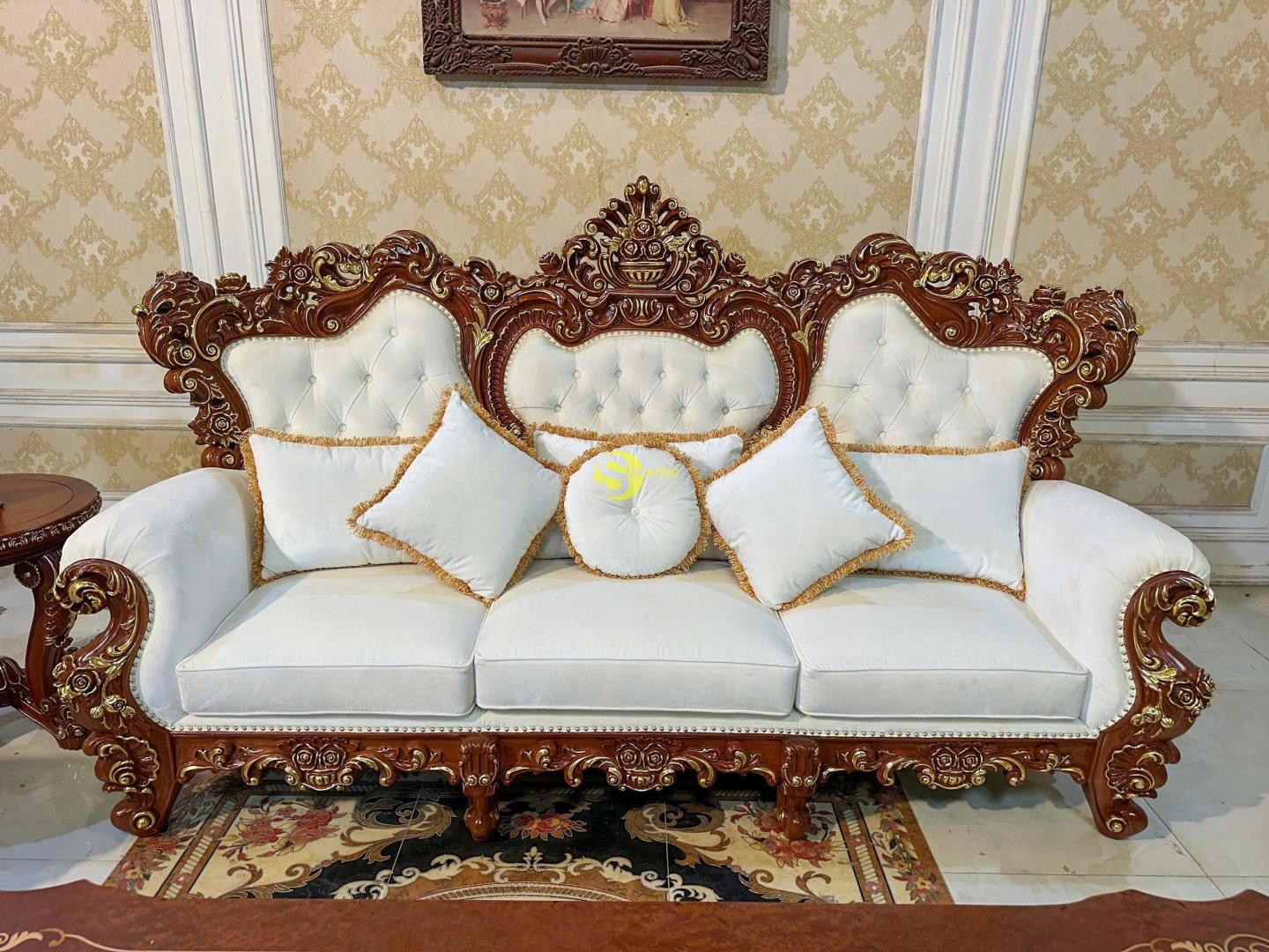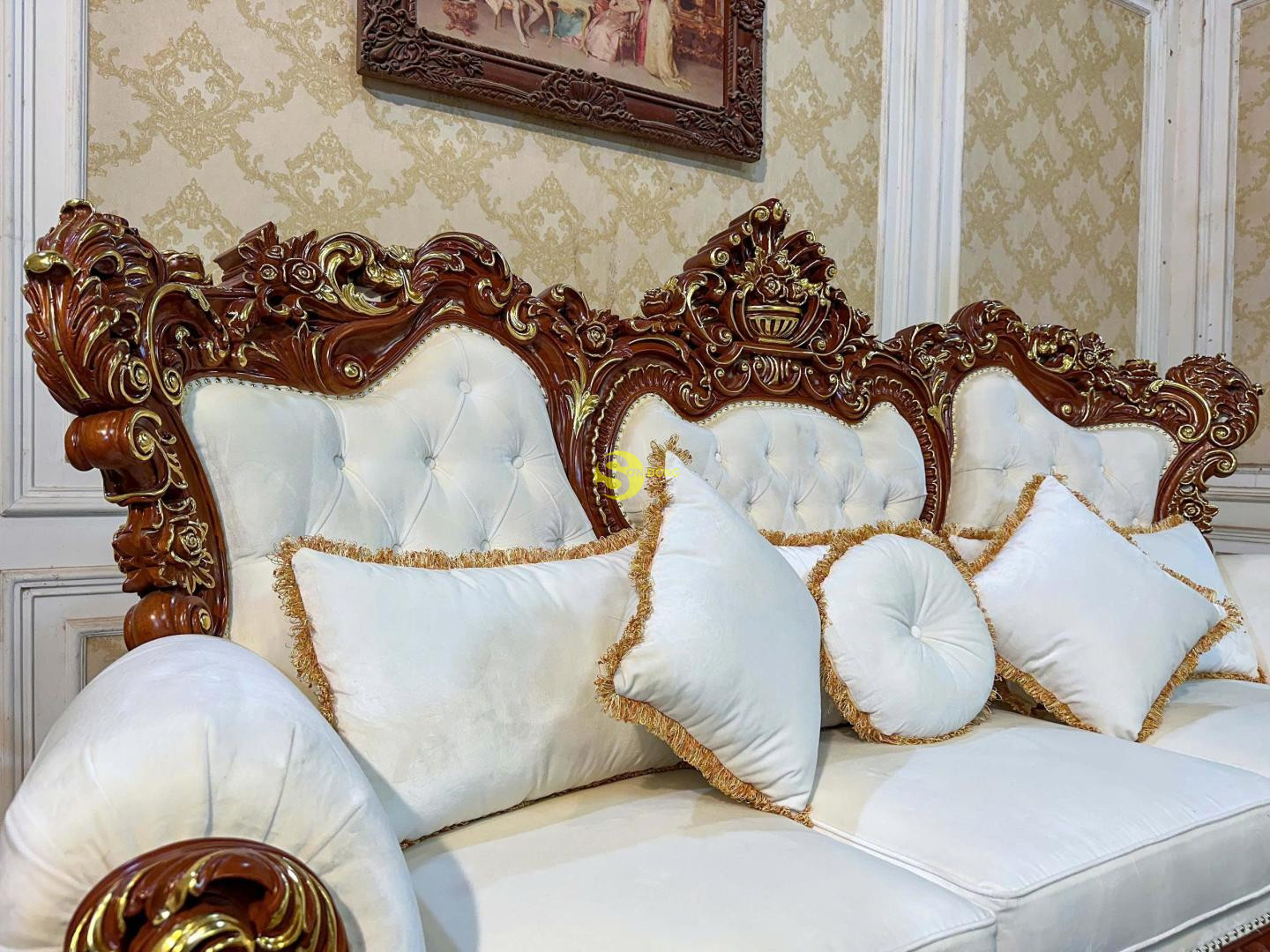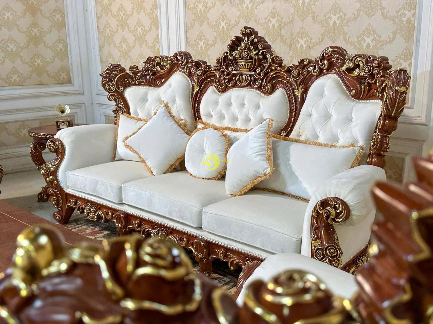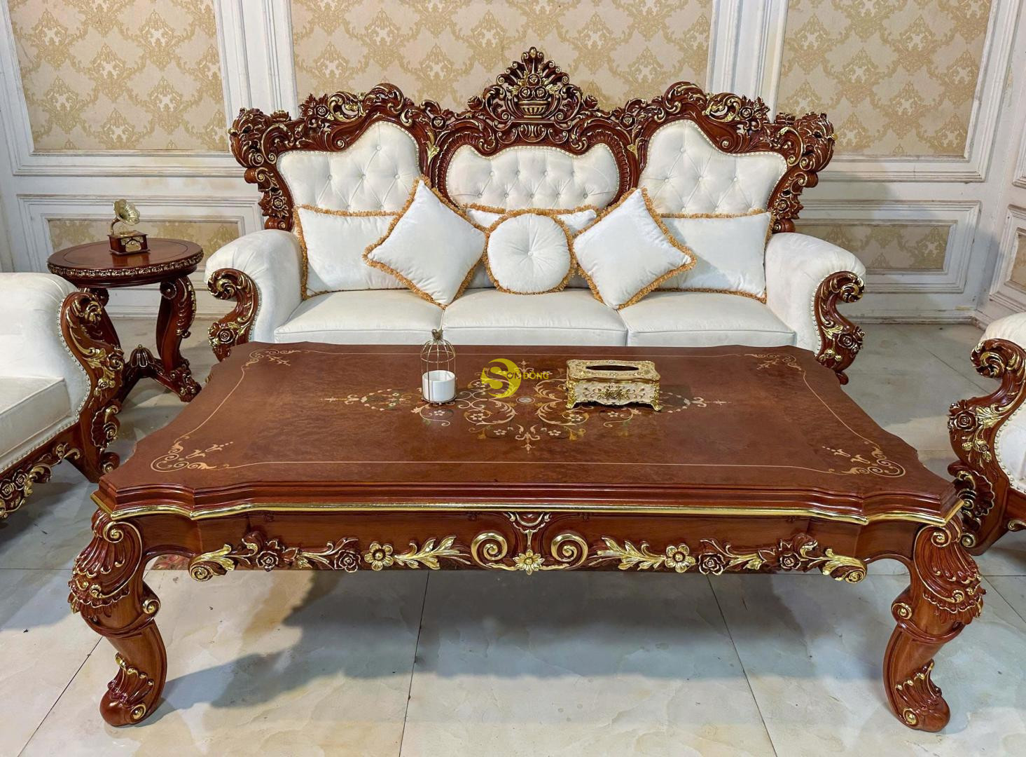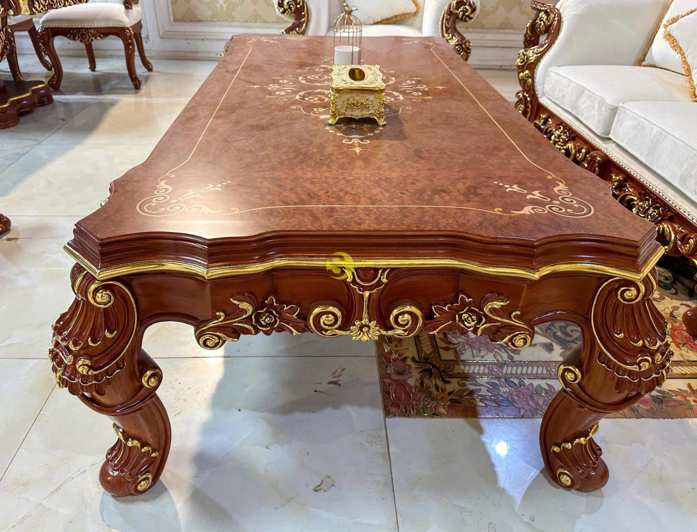 * Chất liệu: gỗ gõ đỏ Nam Phi + dát vàng Ý điểm xuyến + bọc vải nhung Acasia.