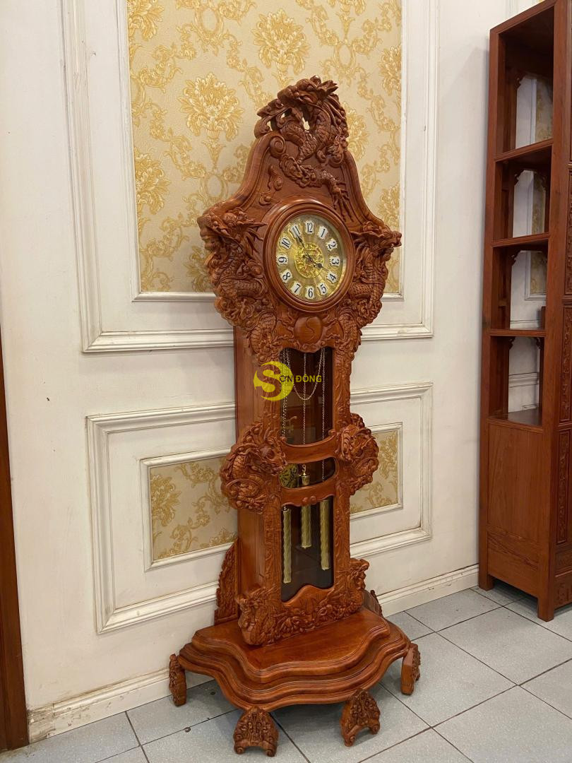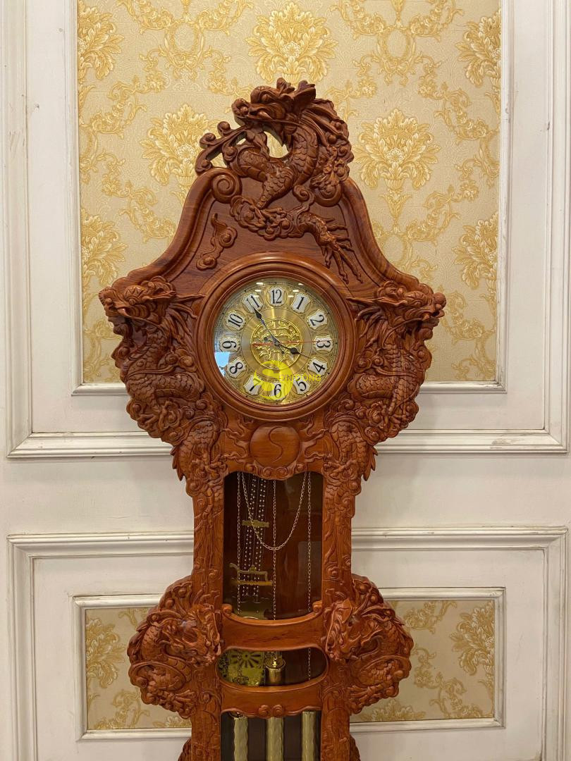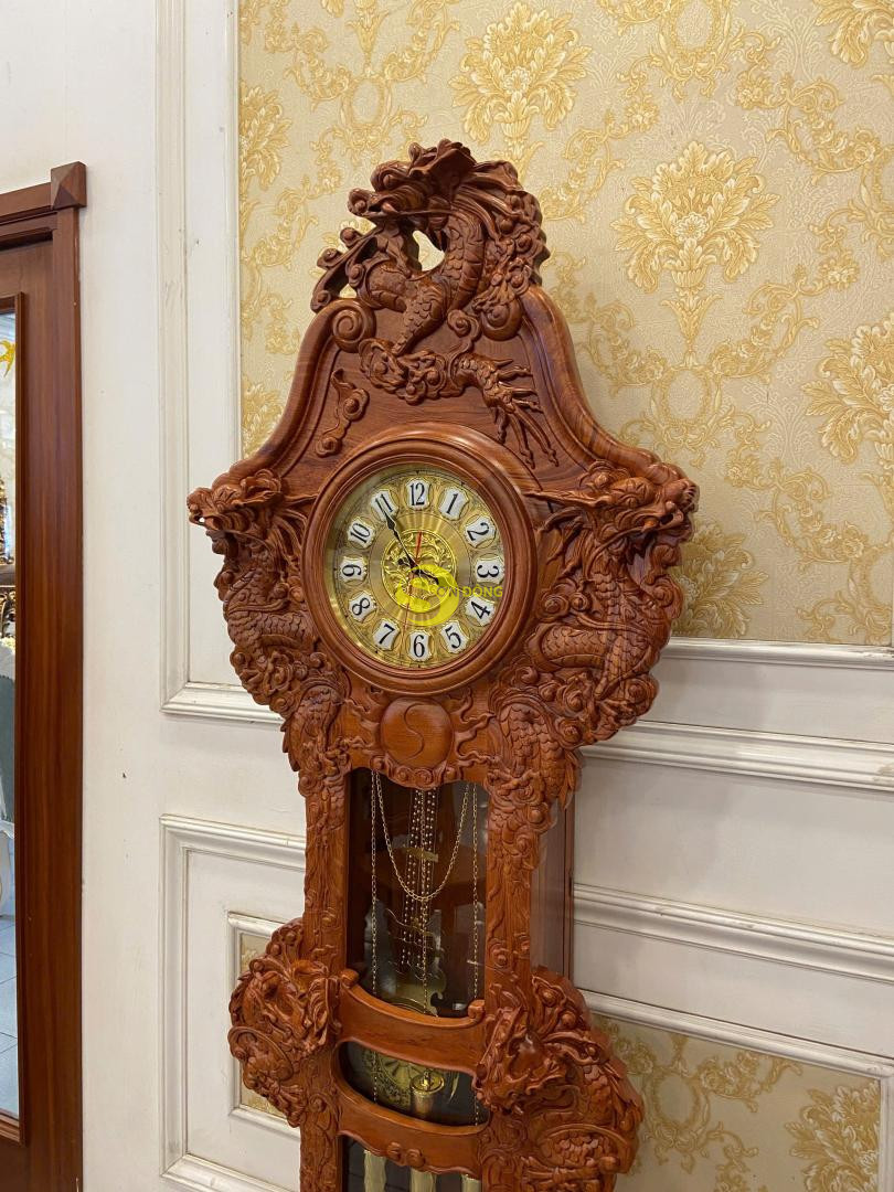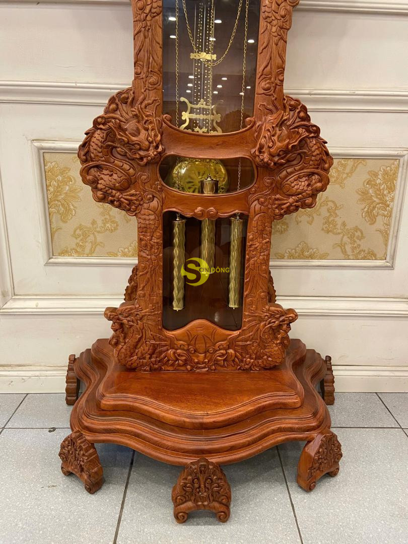 – Mẫu đồng hồ cây chạm cửu long từ chất liệu gỗ hương cao cấp này không những giúp gia chủ khẳng định đẳng cấp địa vị mà còn giúp cho không gian nội thất sang trọng, giúp con người ta cảm thấy thoải mái, dễ chịu, bớt lo toan cuộc sống sau những hồi chuông gõ hay những tiếng tích tắc đầy êm tai mỗi khi điểm phút, điểm giờ. Cái thú vị nhất khi chơi loại đồng hồ cây này là bạn còn có thể nhìn ngắm thưởng thức được những nét chạm mềm mại hình ảnh cửu long đầy ý nghĩa phong thủy trên bộ sản phẩm.