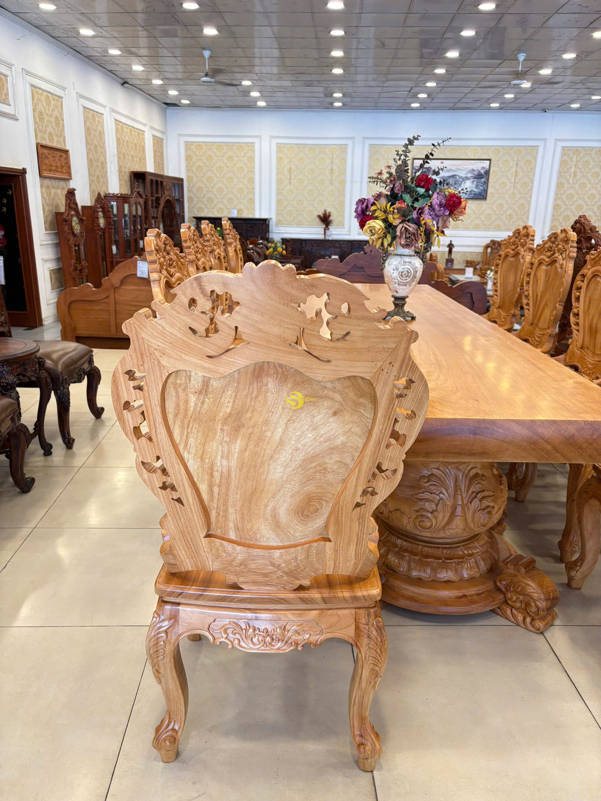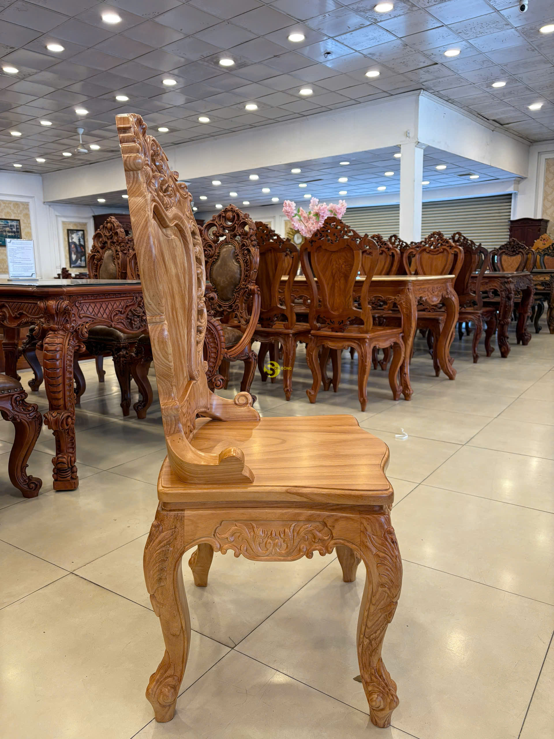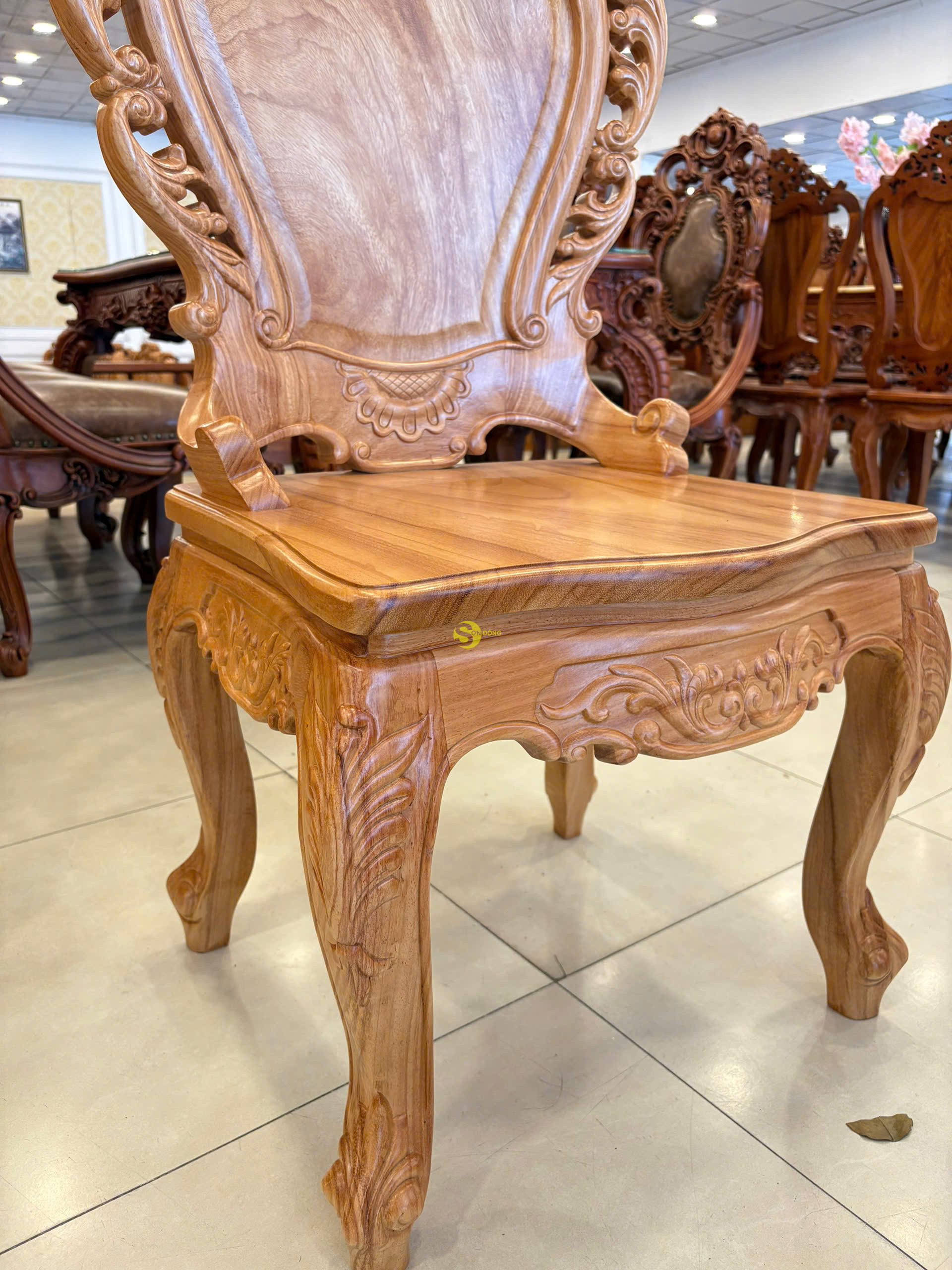 Chất liệu: gỗ gõ đỏ, tựa ghế làm bằng gõ Lào quý hiếm Kích thước : Cao 116cm, Ngang 62cm, Sâu 48cm.
