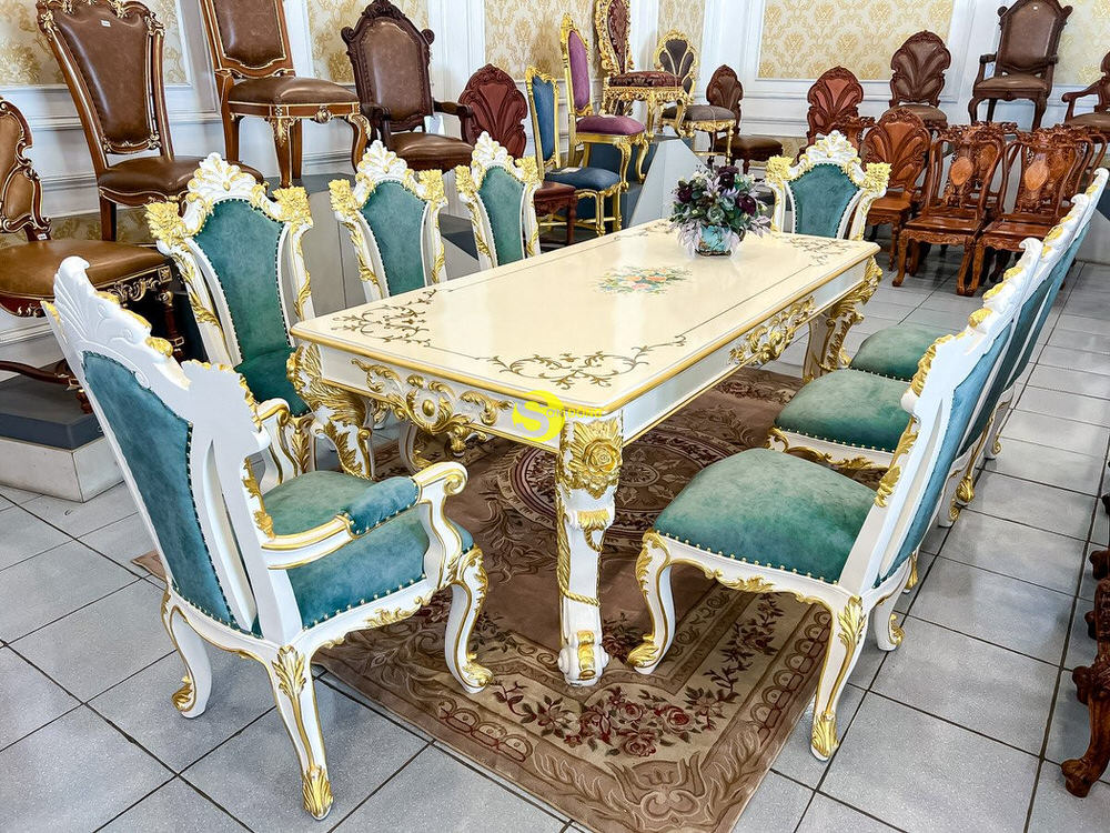 15/ Bộ bàn ăn cổ điển 8 ghế sơn trắng dát vàng gỗ beech – BBA99